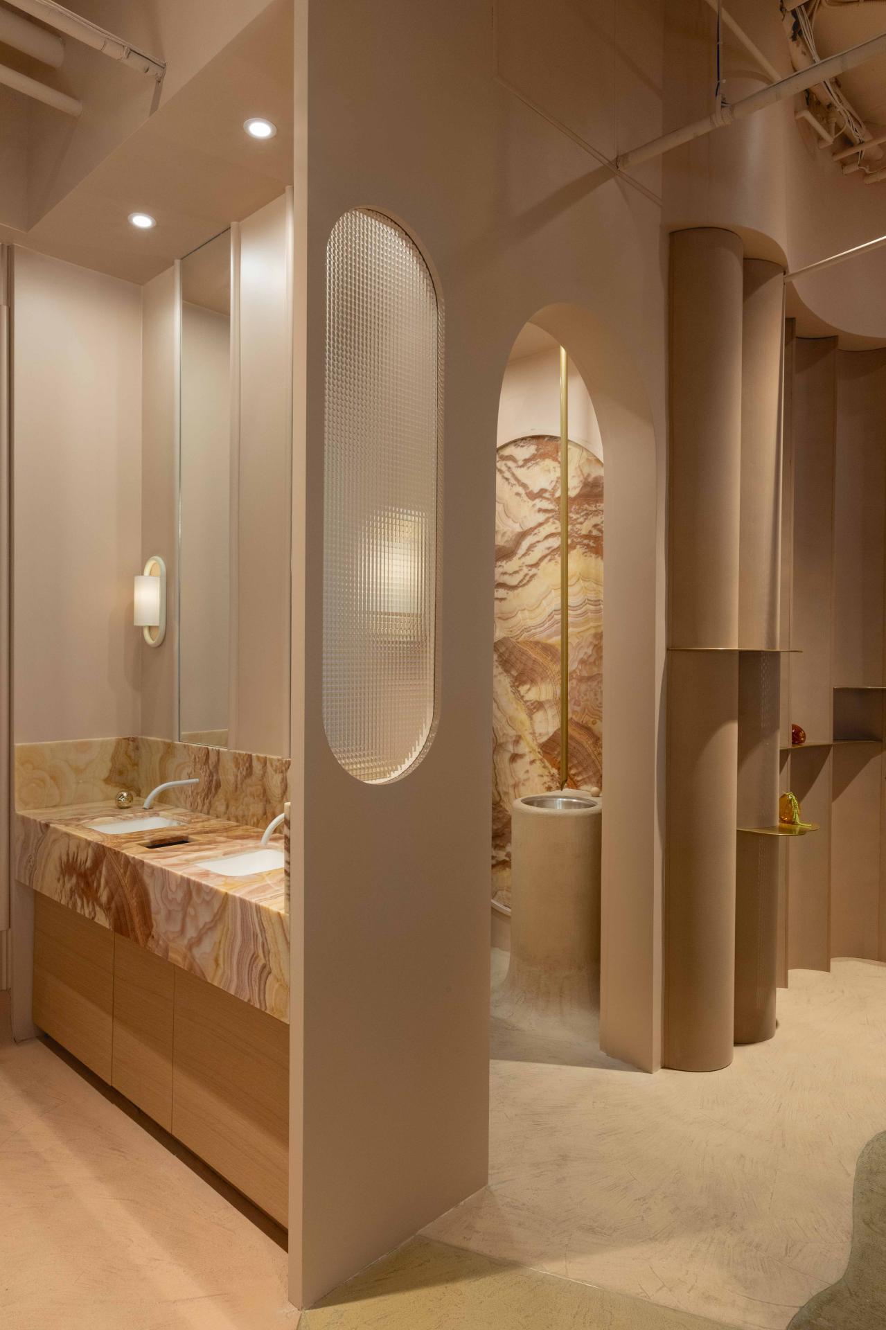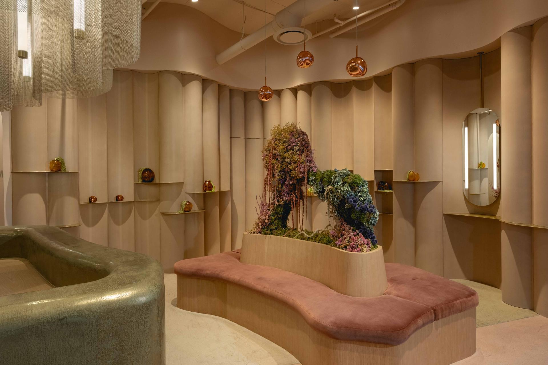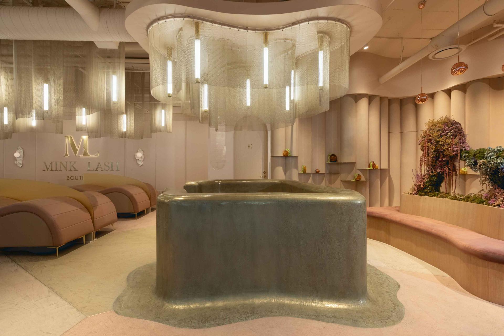 The interior design seamlessly integrates with the architecture, blurring the line between fantasy and reality while offering a serene oasis for clients to indulge in luxury lash treatments. Texture, depth, and a masterful use of light and shadow enhance the putty pink monochromatic palette that envelops the space. This is expressed most strikingly in the retail area, where oversized curved panels clad the walls from floor to ceiling. Organically shaped brass shelving intersects these panels, creating a tactile backdrop for an ethereal yet highly functional retail experience.