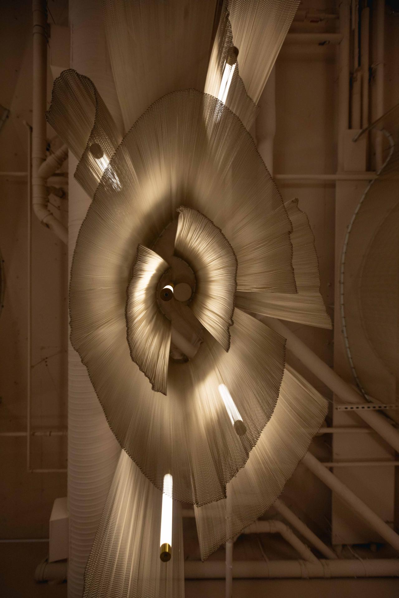 The pièce de résistance is the custom mesh ceiling. Inspired by the fluid movement of rippling water and the unfolding layers of a blooming flower, delicate sheets of metal mesh radiate outward from a central point. While visually striking from below, the true beauty of the installation is revealed when viewed from the horizontal vantage of the treatment beds—where its layered intricacies and gentle illumination from suspended pendants create a mesmerizing canopy above.