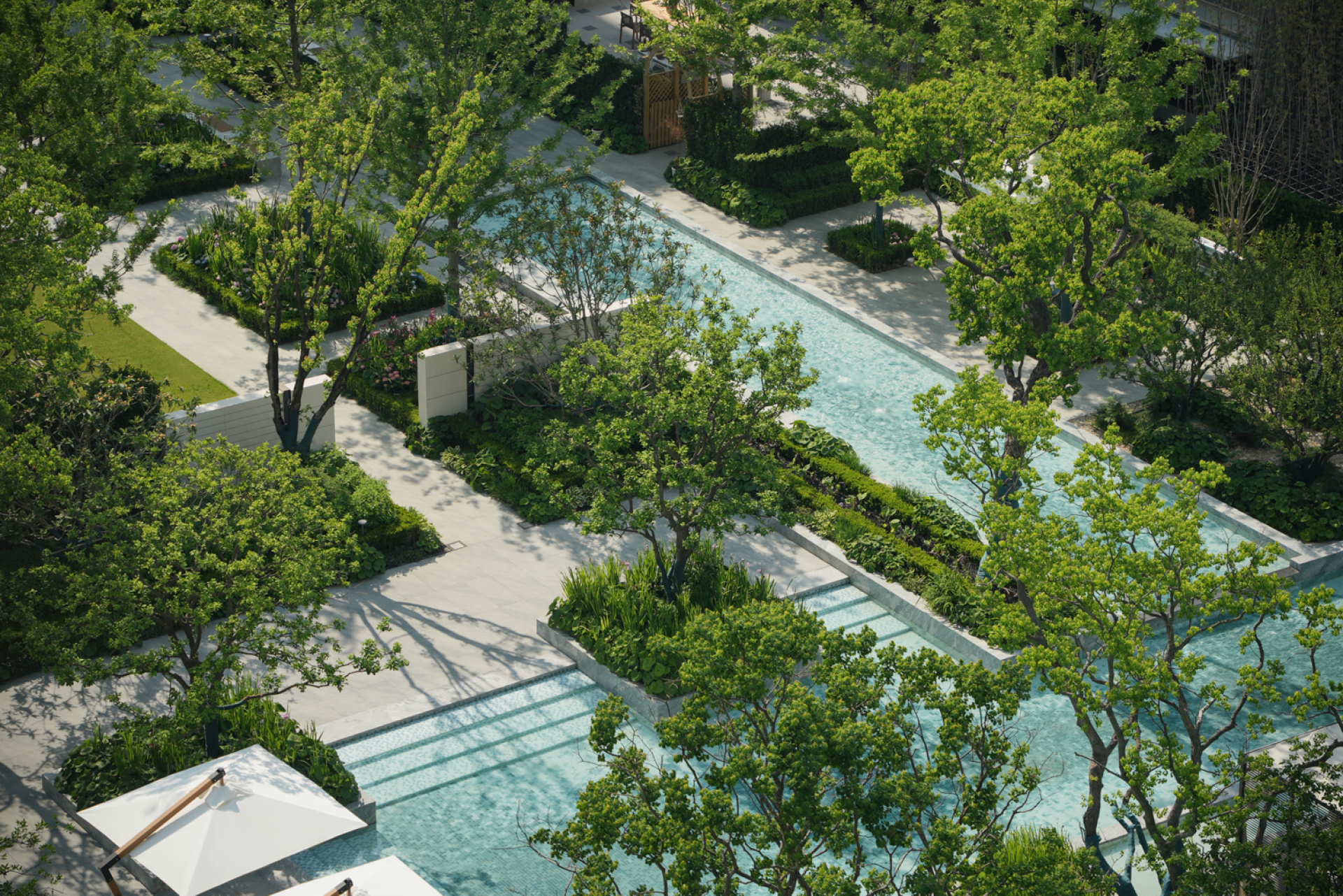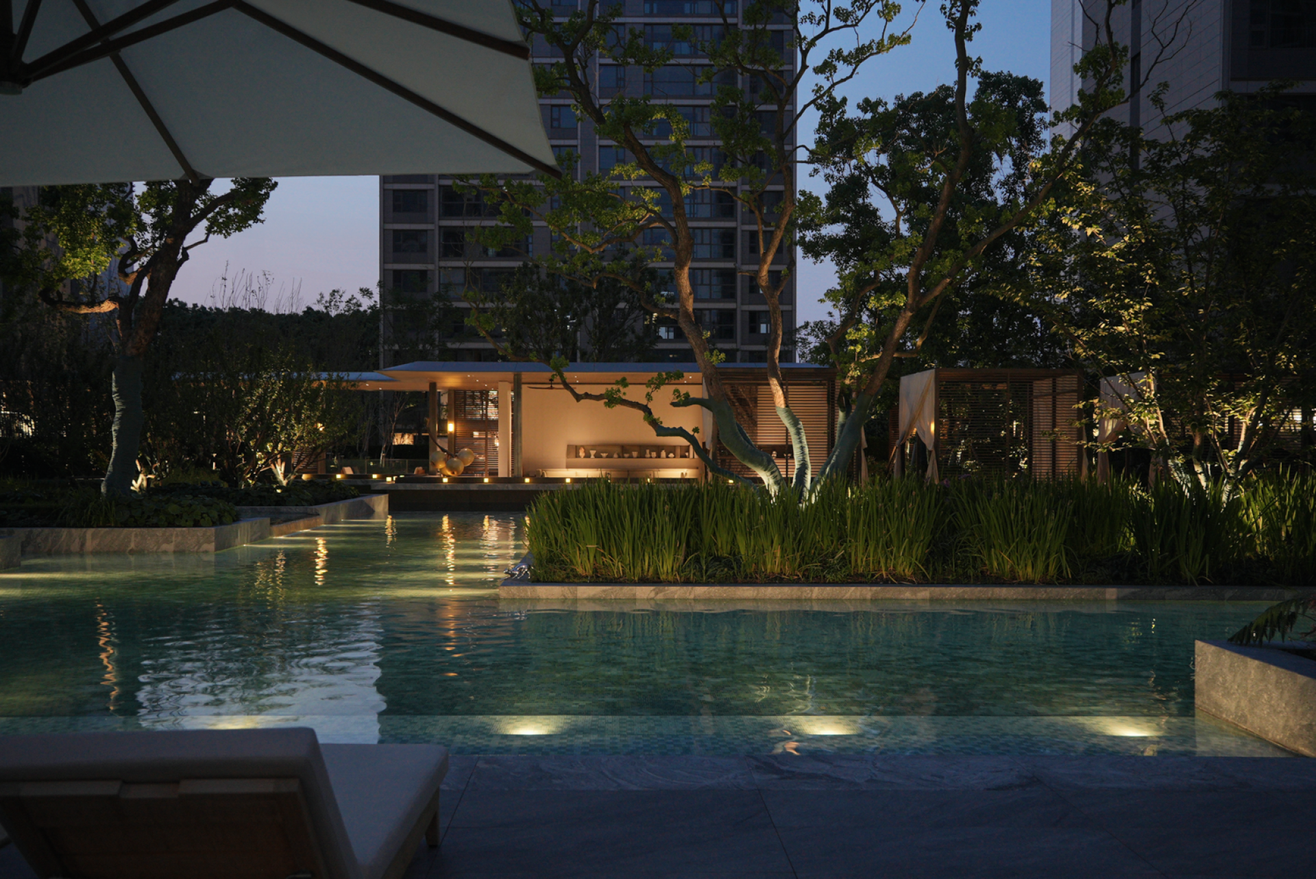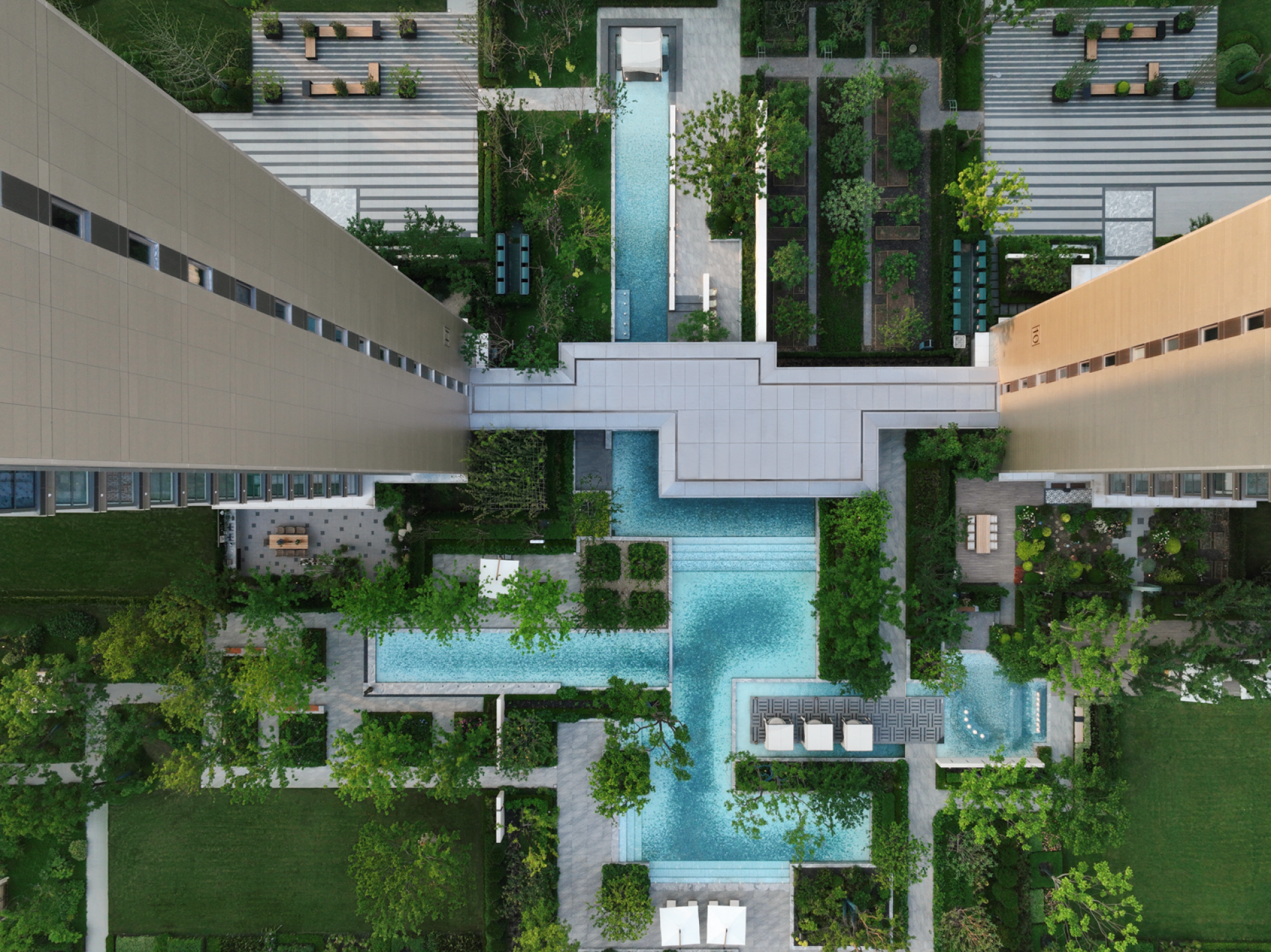 "Water" is the core thread running through the design. The central water system meanders from the heart of the site, connecting functional areas such as the stilt floor, viewing terrace, and lawn in a flowing manner, endowing the space with a coherent and vivid narrative sense. Drawing inspiration from the water town culture of "living by the water", the design arranges verandas, curtain pavilions, water-side platforms, and leisure recliners around the core water surface, constructing a multi-dimensional waterfront scene layer by layer. This makes the residential area seem to float on the blue waves, fully demonstrating a sense of relaxed breathing. The bottom of the pool is paved with a special light blue material, simulating the clarity and transparency of an outdoor swimming pool, which not only enhances the vacation atmosphere of the water body but also improves the participatory nature of the landscape.