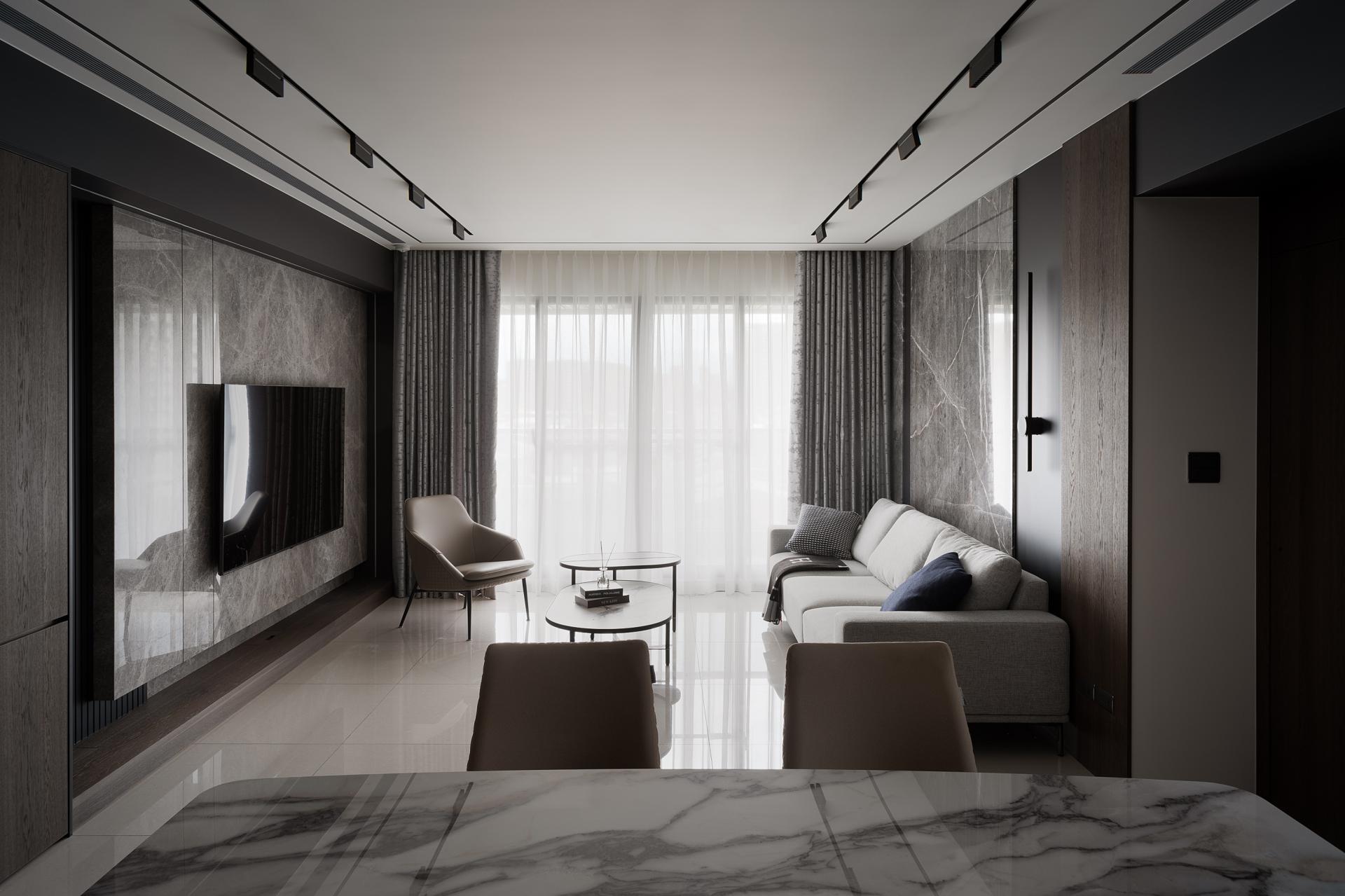 Different types of marble were selected for the TV wall and the wall behind the sofa. The former uses stone with lighter veining to enhance visual focus during viewing, while the latter adopts a single slab with bold fractures, serving as a striking feature wall—like a restrained abstract painting. Linear divisions of wood veneer and black lacquer define the surfaces with clear layering and order.