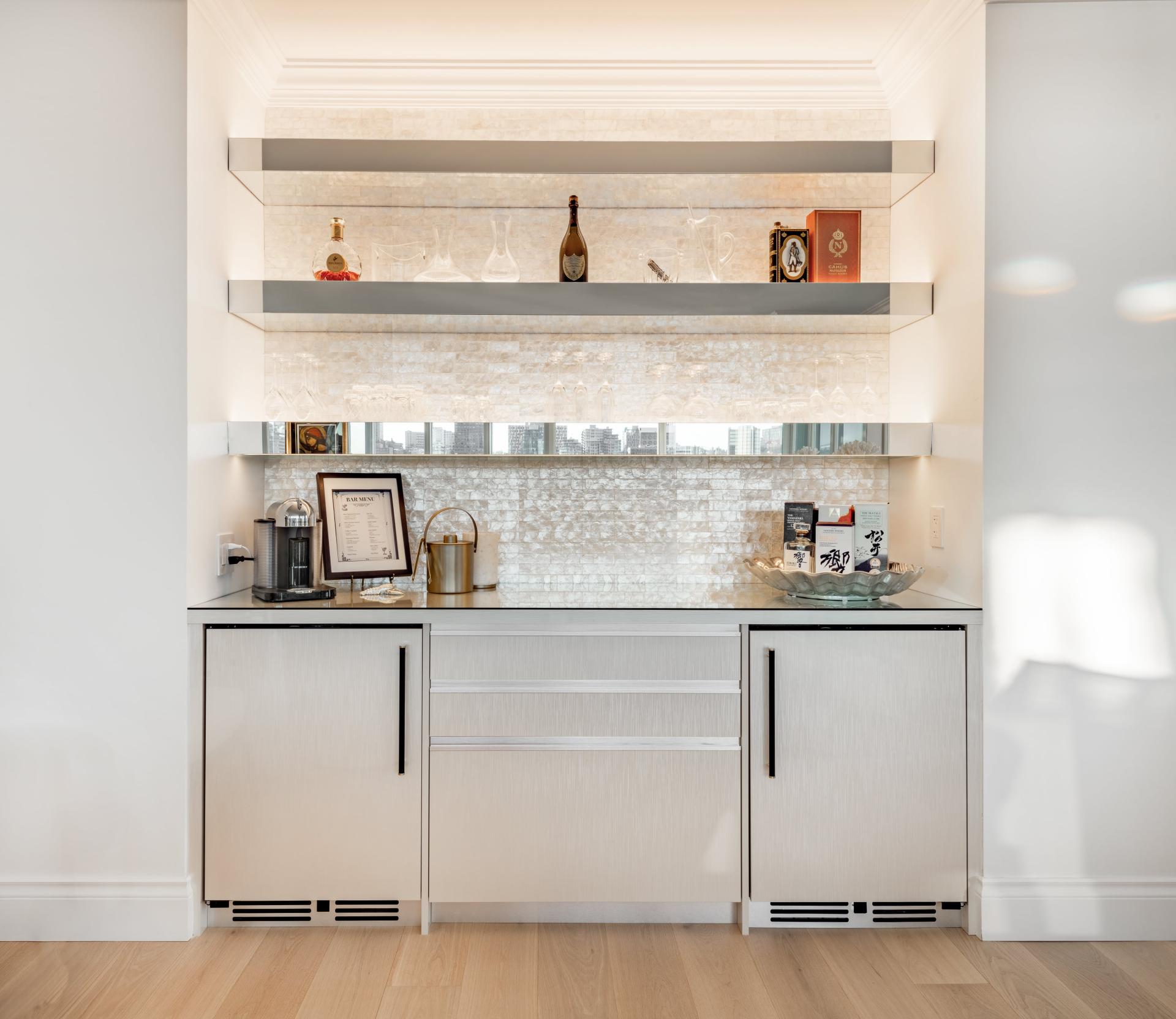Accessibility is integrated seamlessly into the design — zero thresholds, wide turning radii, slip-resistant flooring, and lever-style handles provide ease of movement and safety without aesthetic compromise. Reinforced walls anticipate future grab bar installation, while clear sightlines, layered task lighting, and contrasting surfaces enhance visibility and independence.