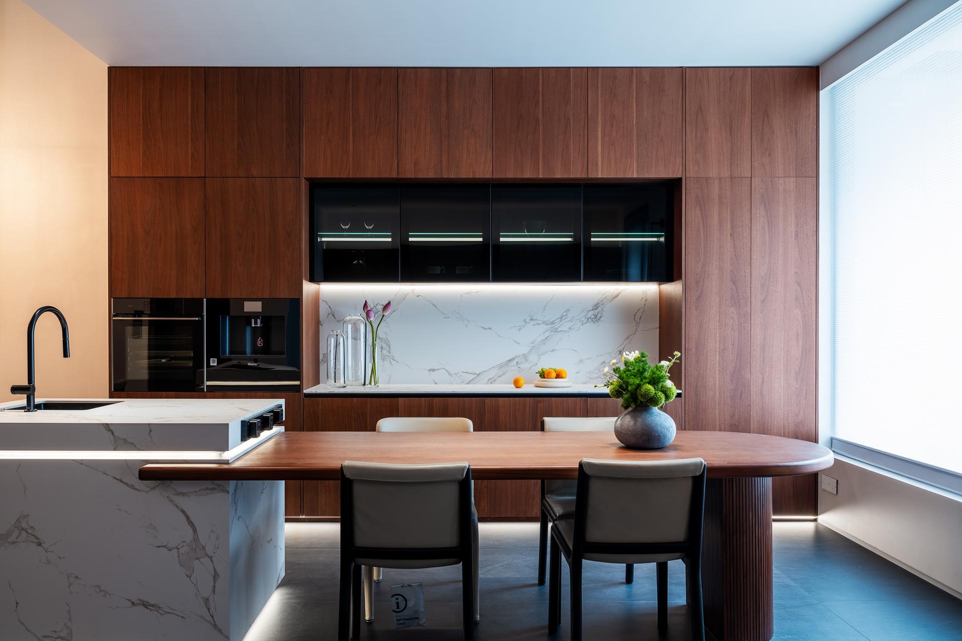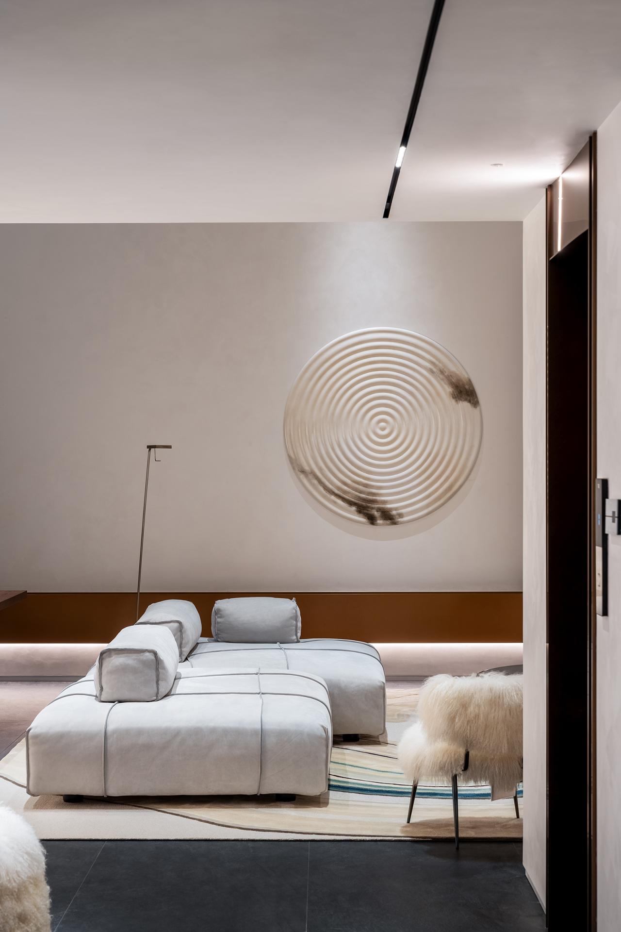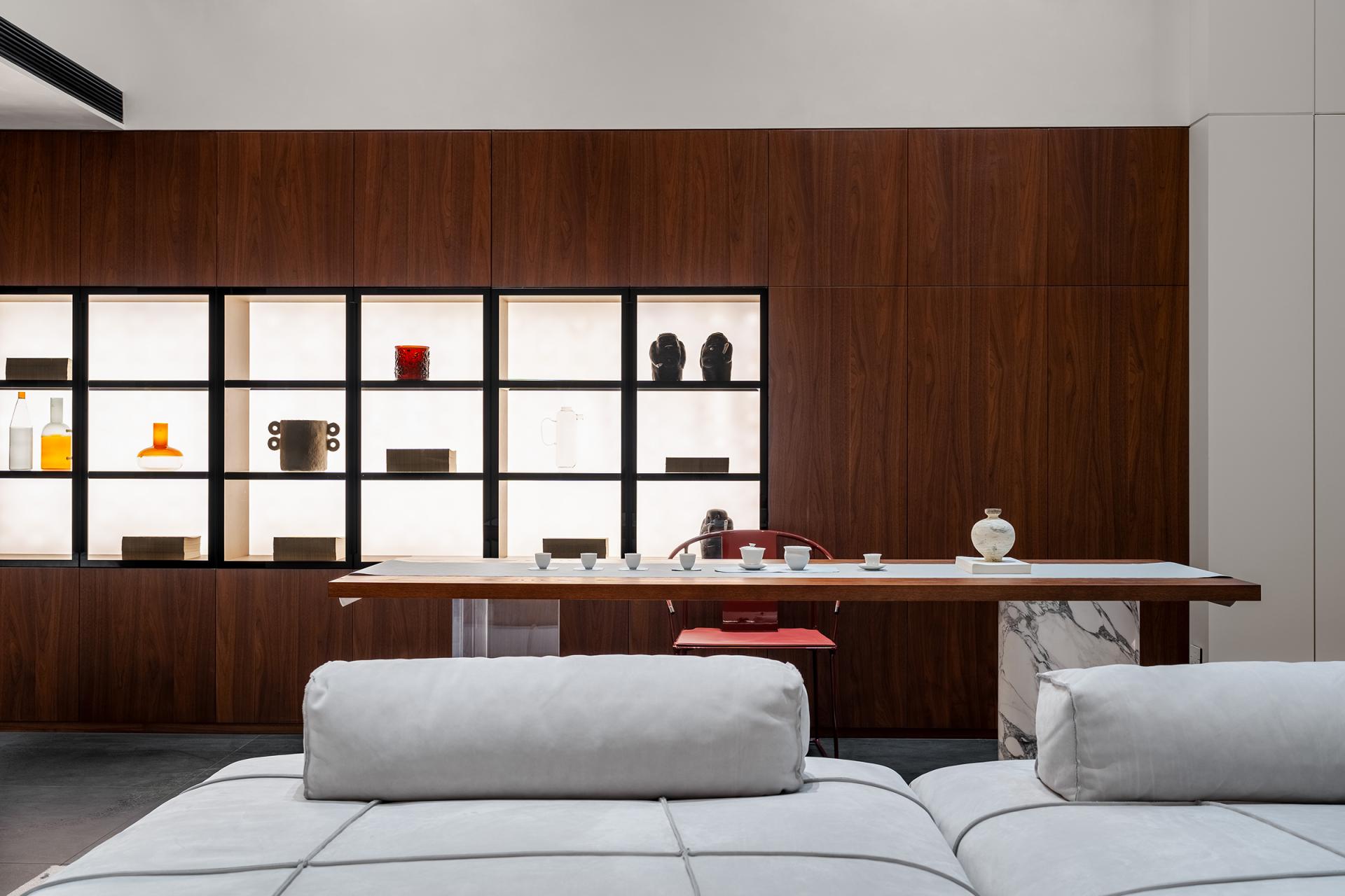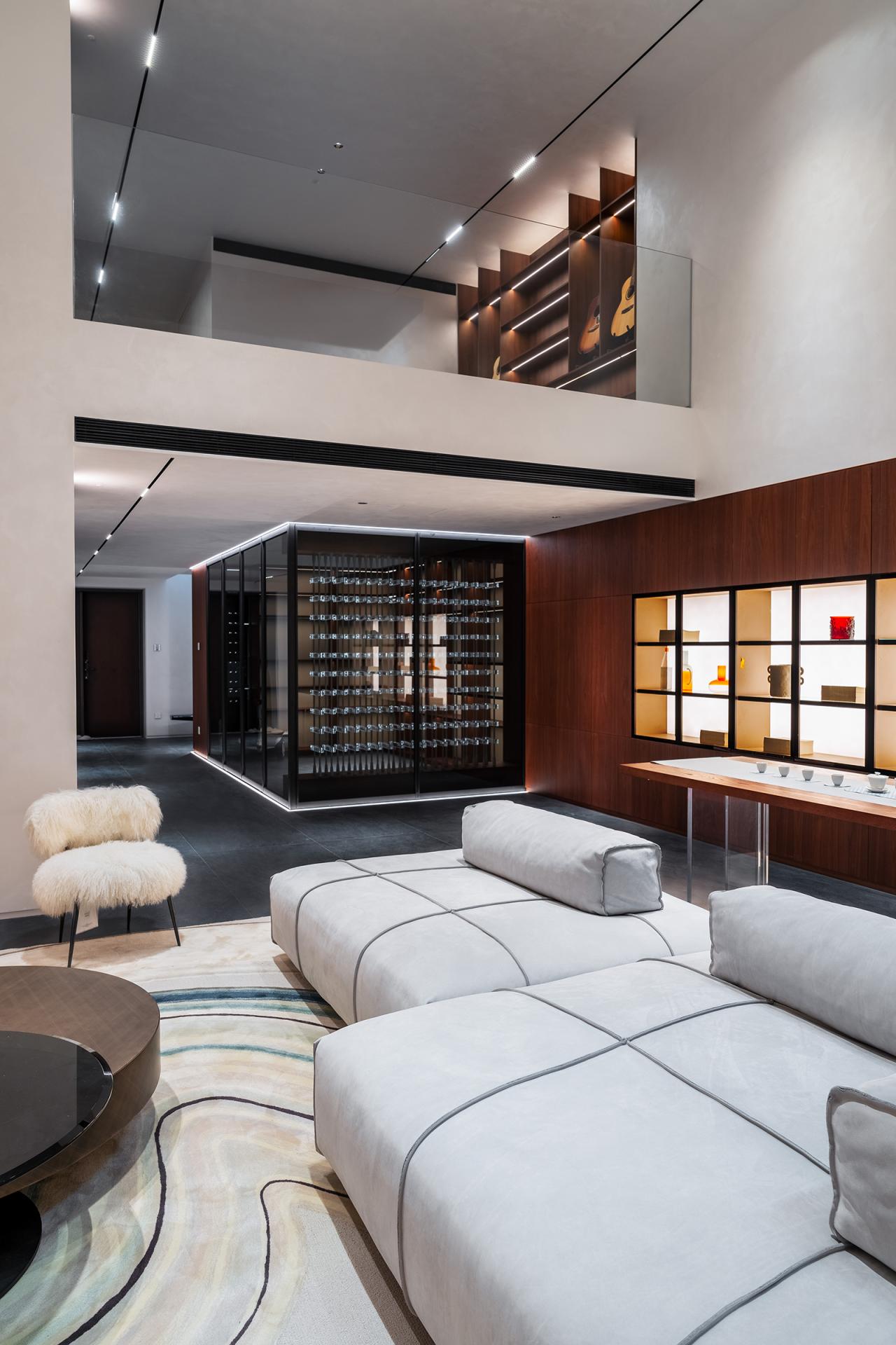Spatial planning follows a clear functional logic. The ground and first floors serve as social spaces for hosting, dining, and tea gatherings, while the second to fourth floors provide private living areas in a hotel-suite format, each room equipped with independent cloakrooms and bathrooms to ensure privacy and comfort. A multifunctional island transforms the conventional living room into a flexible social hub, supporting breakfast, afternoon tea, and casual family interaction. The lower basement accommodates staff functions and storage, while also displaying the owner’s musical instruments.