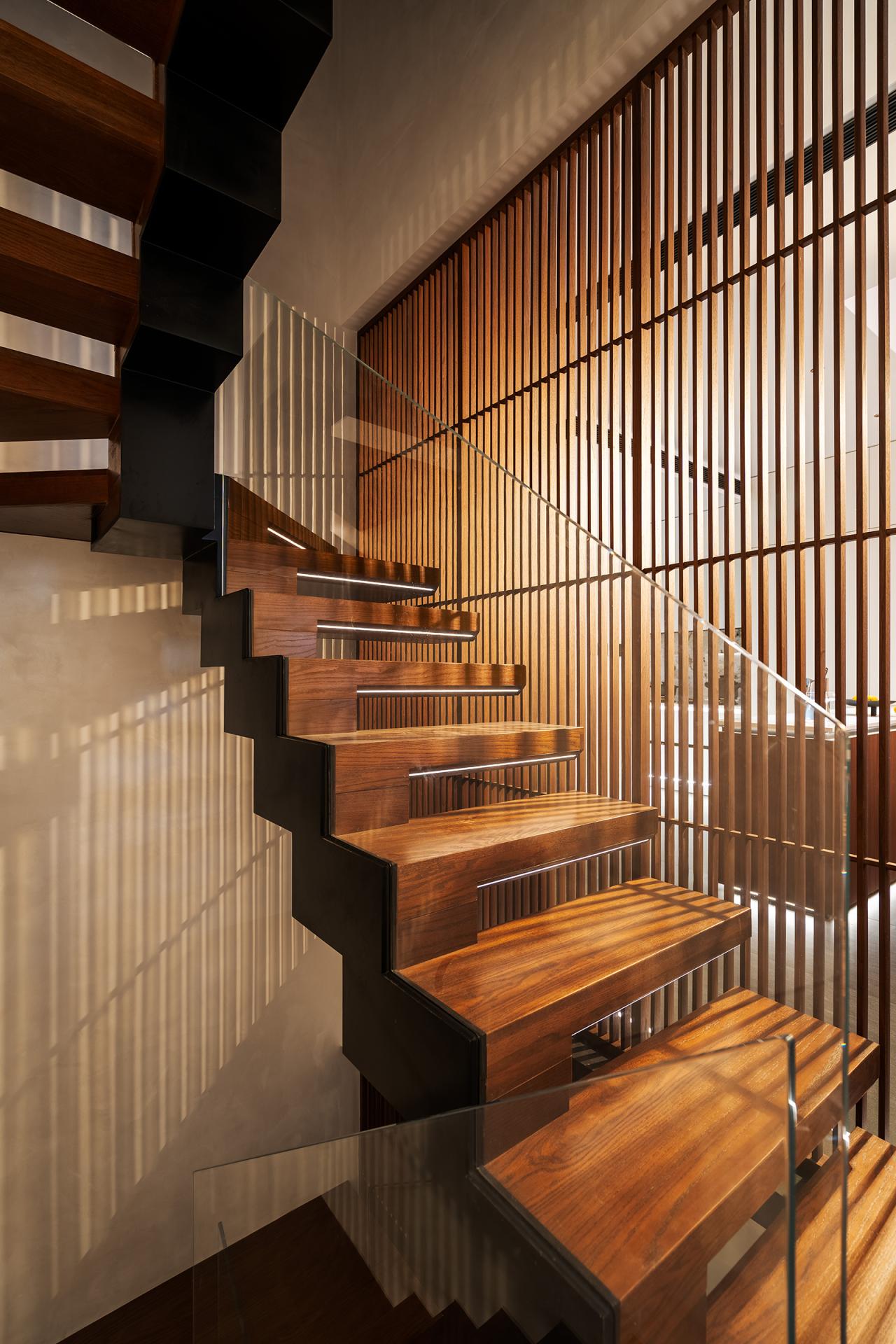 Natural light and ventilation are prioritized throughout. The stairwell creates continuous vertical openness, while the top floor features an intelligent skylight, echoing the courtyard concept and allowing residents to stargaze and enjoy natural breezes. The negative second-floor entry hall introduces dual patios, balancing daylight and creating a serene arrival sequence with water elements.