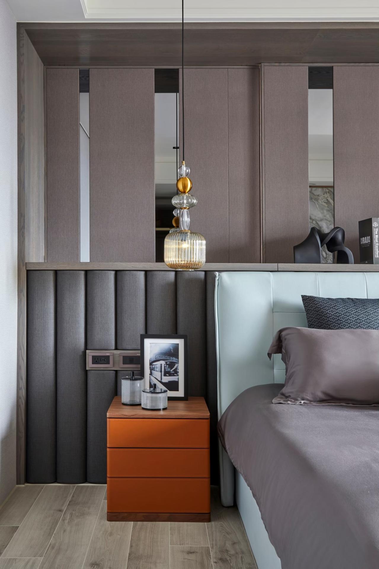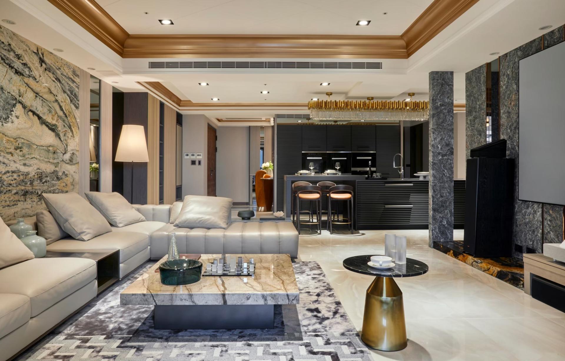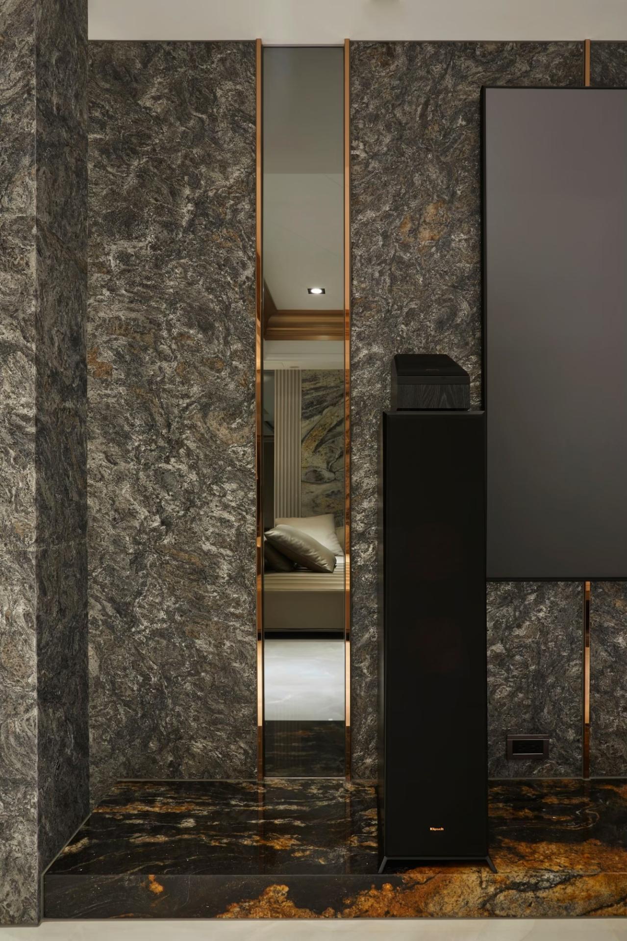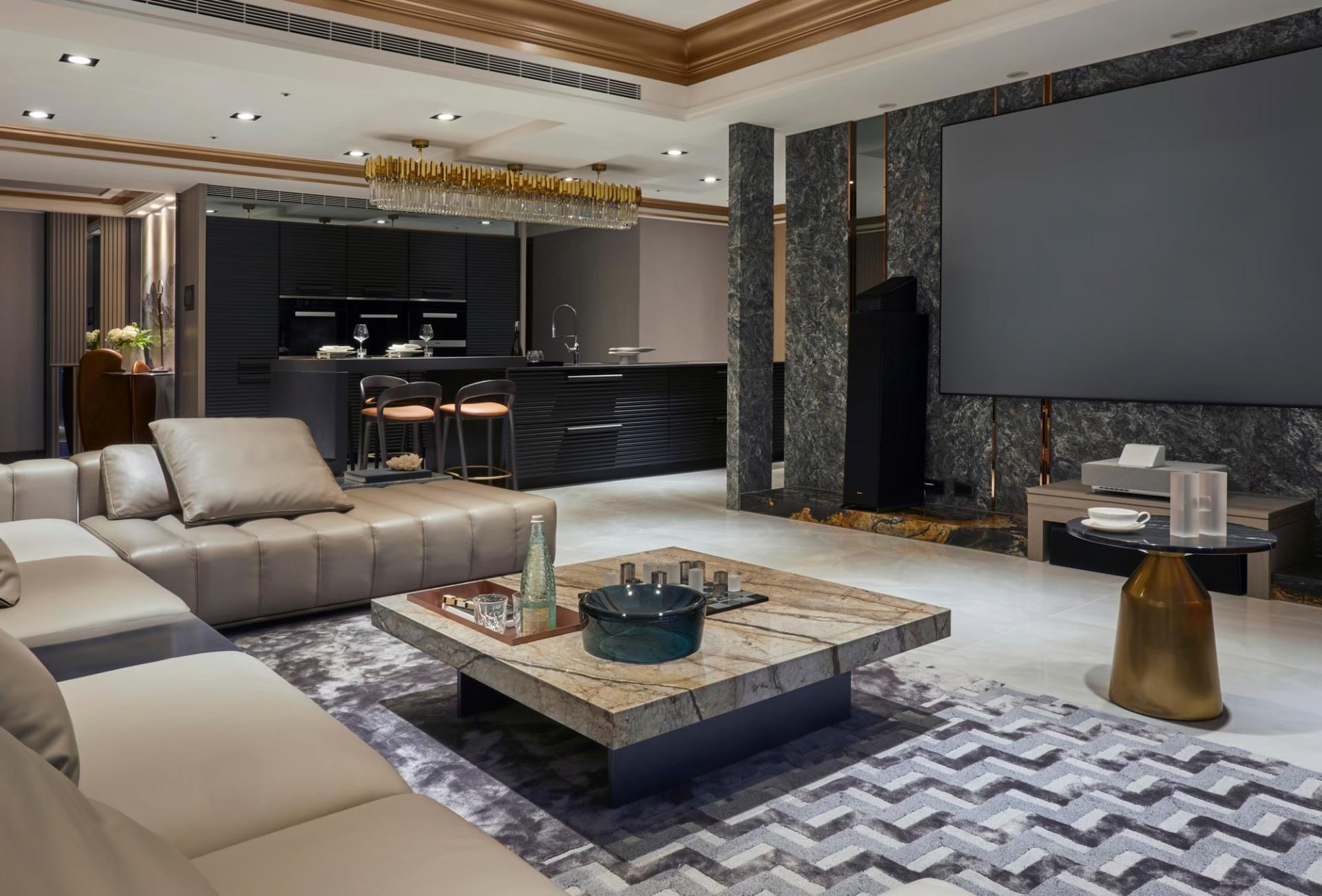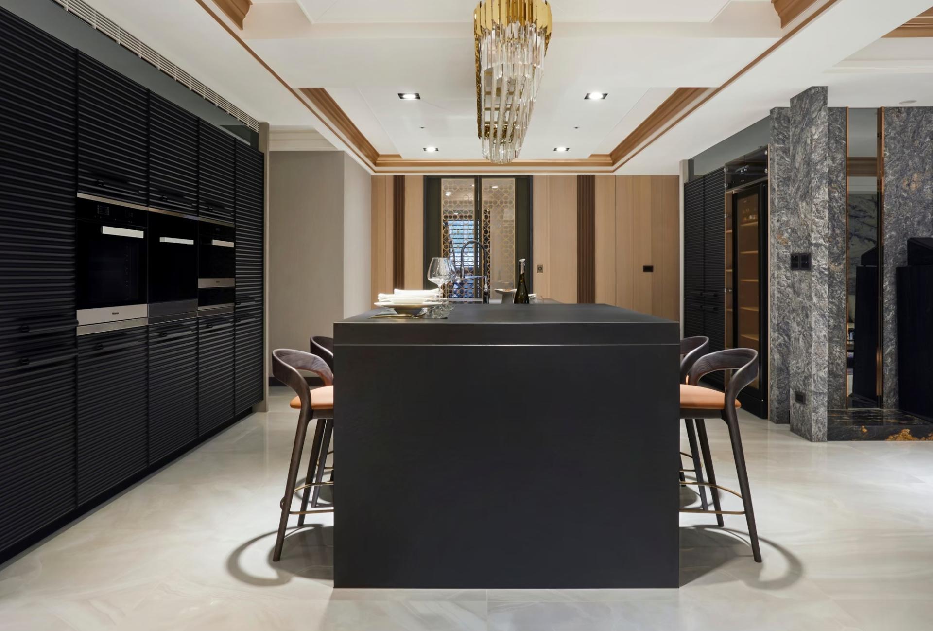 At the entrance, a marble wall veined like ink-washed paper introduces the Eastern idea of "kai men jian shan", opening the view directly toward strength and direction. From that point, the interior unfolds in measured succession. The living and dining areas align along a quiet axis anchored by a monolithic island, while light glides across surfaces as if tracing the folds of paper, connecting each volume through rhythm and reflection.