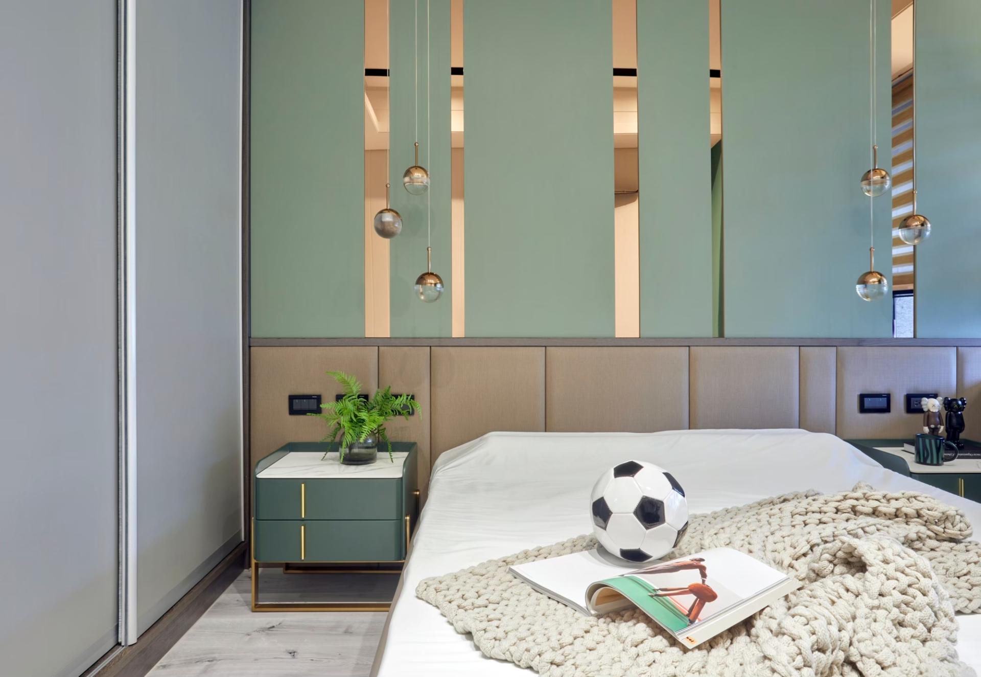 Every room continues this geometry with variations of tone and texture. The master suite balances grey and blue with a touch of orange, the daughter’s room layers blush and ivory, and the son’s combines mint and taupe. Each palette reads as a subtle modulation within one folded form.