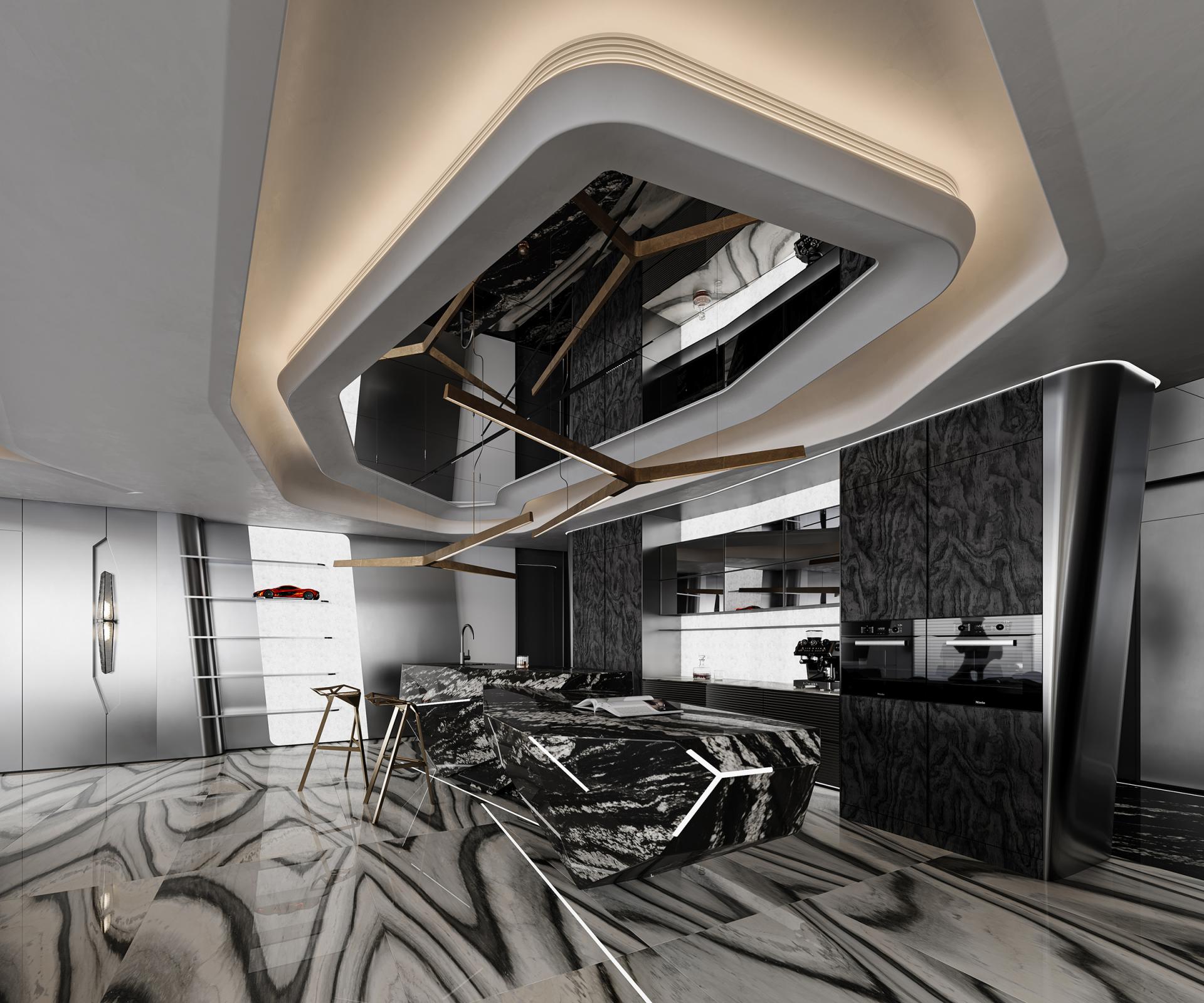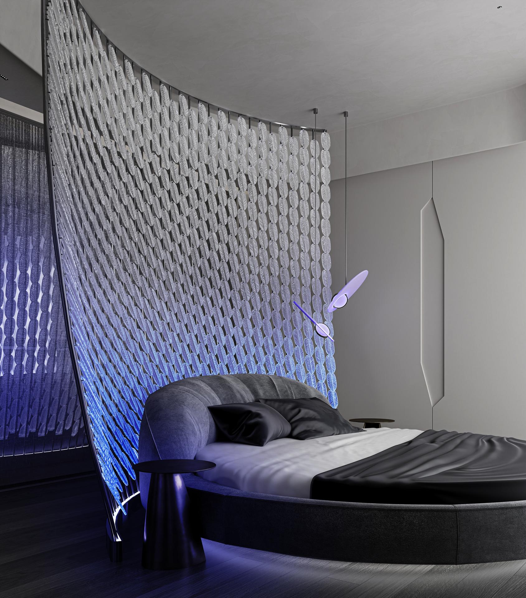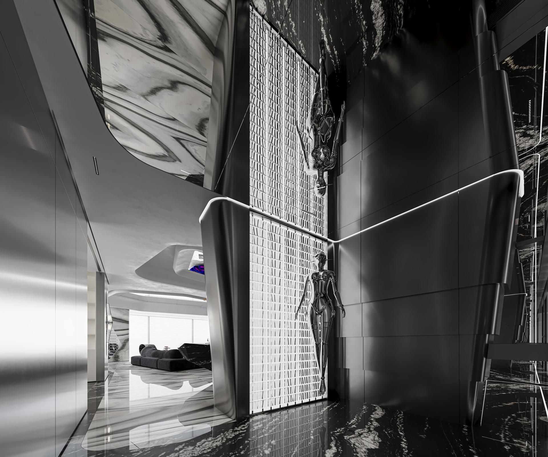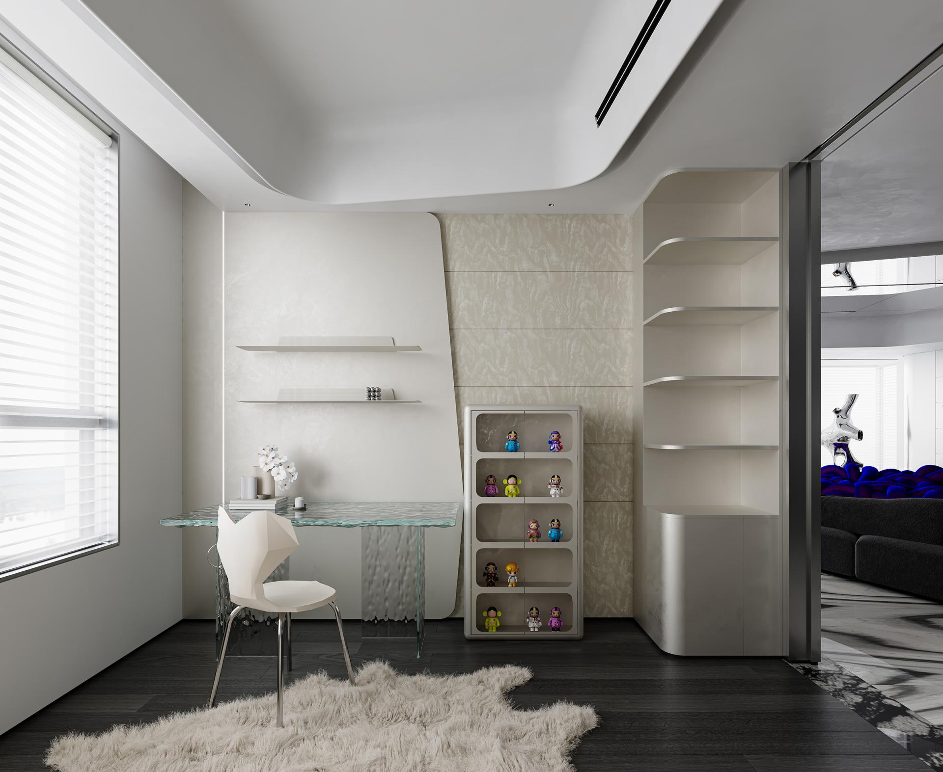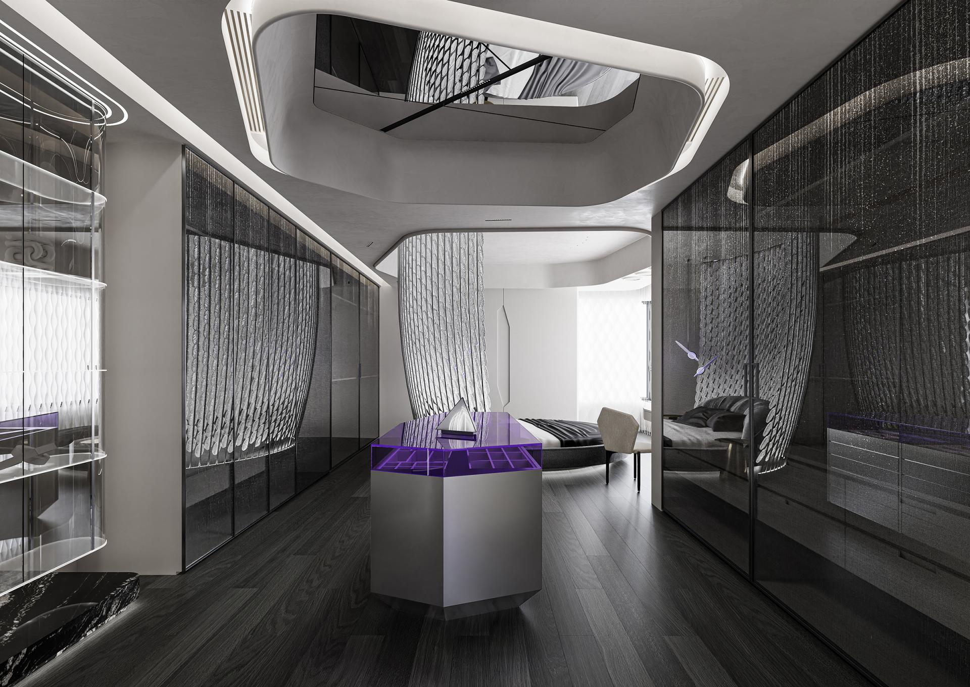 Inspired by the fluid aesthetics and precision of a McLaren sports car, the design adopts “folding lines” as a core visual and structural motif, infusing the space with futuristic and dynamic energy. From ceilings and walls to kitchen islands and furniture placement, this language of motion redefines spatial perception and creates a highly personalized living experience. At the entryway, a striking combination of a mechanical figurine, artistic glass, and a folded-line metal cabinet—enhanced by custom lighting—sets the tone with a sense of sci-fi elegance. These folding lines continue seamlessly across the interiors, lending continuity and rhythm to the spatial composition. The layout emphasizes flow and openness. The fully open living area resembles a contemporary art gallery, with iconic pieces like Edra’s On the Rocks and Boa sofas placed to create a sculptural interweave. Even structural limitations like immovable columns are transformed into design features, integrating seamlessly with visual focal points such as the fireplace and glass wine cabinet. Spatial transitions are enhanced by visual layering and material transparency. The open study introduces flexibility through a retractable partition wall, allowing it to convert into a guest room when needed. Design also accommodates pet-friendly features, including a multifunctional balcony zone for two cats. Material selection boldly embraces the homeowner’s affinity for high-performance aesthetics. Reflective metal finishes, mirror elements, artistic glass flakes, and Gucci Grey/Black stones are strategically combined to reflect a sci-fi and industrial vibe. These materials—applied with meticulous detailing—convey the essence of automotive design: sleek lines, bold textures, and technical refinement. In private areas, the folding-line concept continues through ceiling contours, island cabinetry, and even wall treatments. The master suite’s spatial path is designed as an immersive sequence—entry, vanity, shower, bathtub beneath a starry ceiling, lounge, and cloakroom—forming an experiential loop that mirrors the excitement of a curated journey. Feather glass flakes subtly blur visual boundaries to enhance depth and elegance. Overall, the design prioritizes personalization, movement, and immersive spatial storytelling, rejecting generic templates in favor of a home that embodies identity, lifestyle, and avant-garde aesthetics.