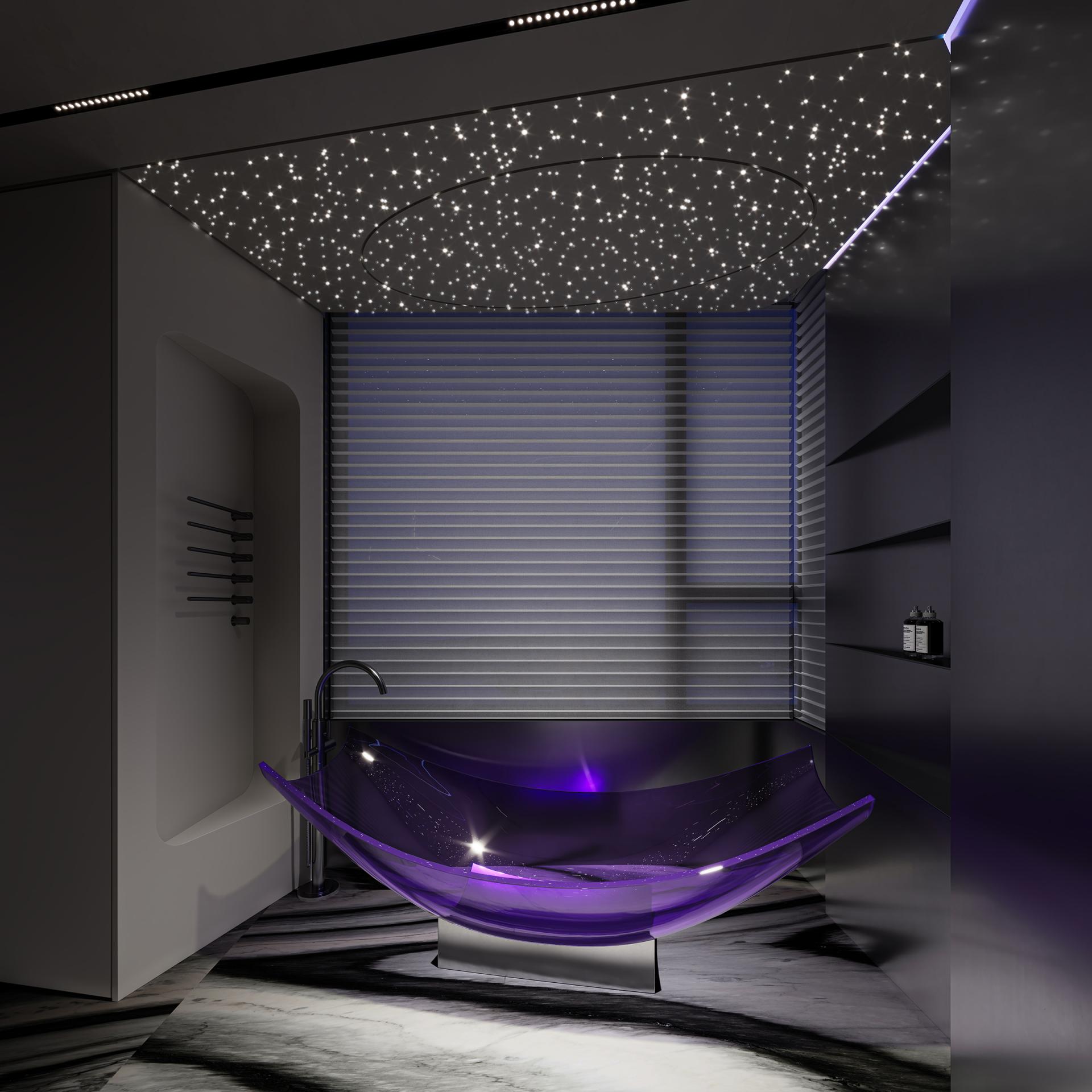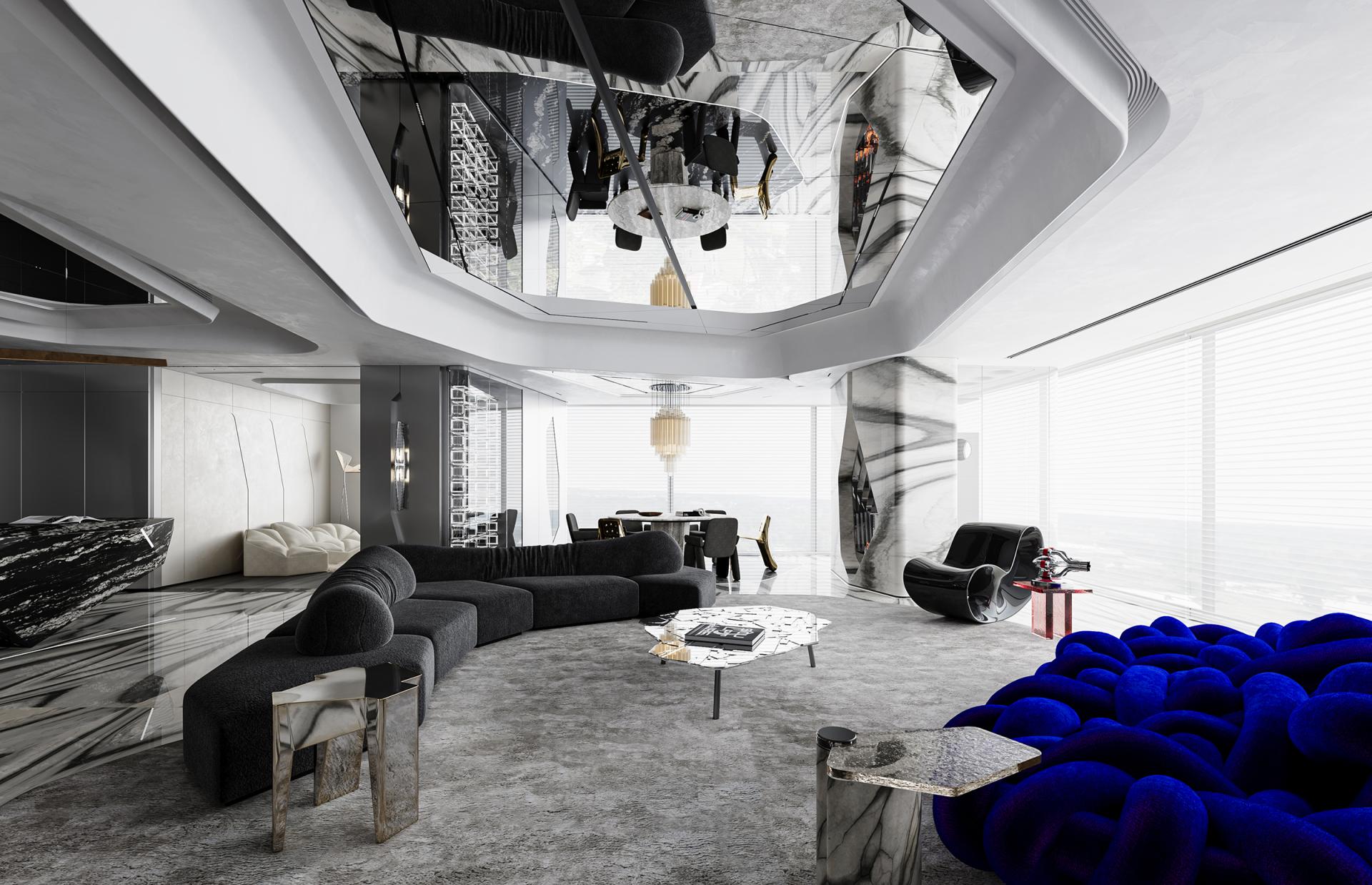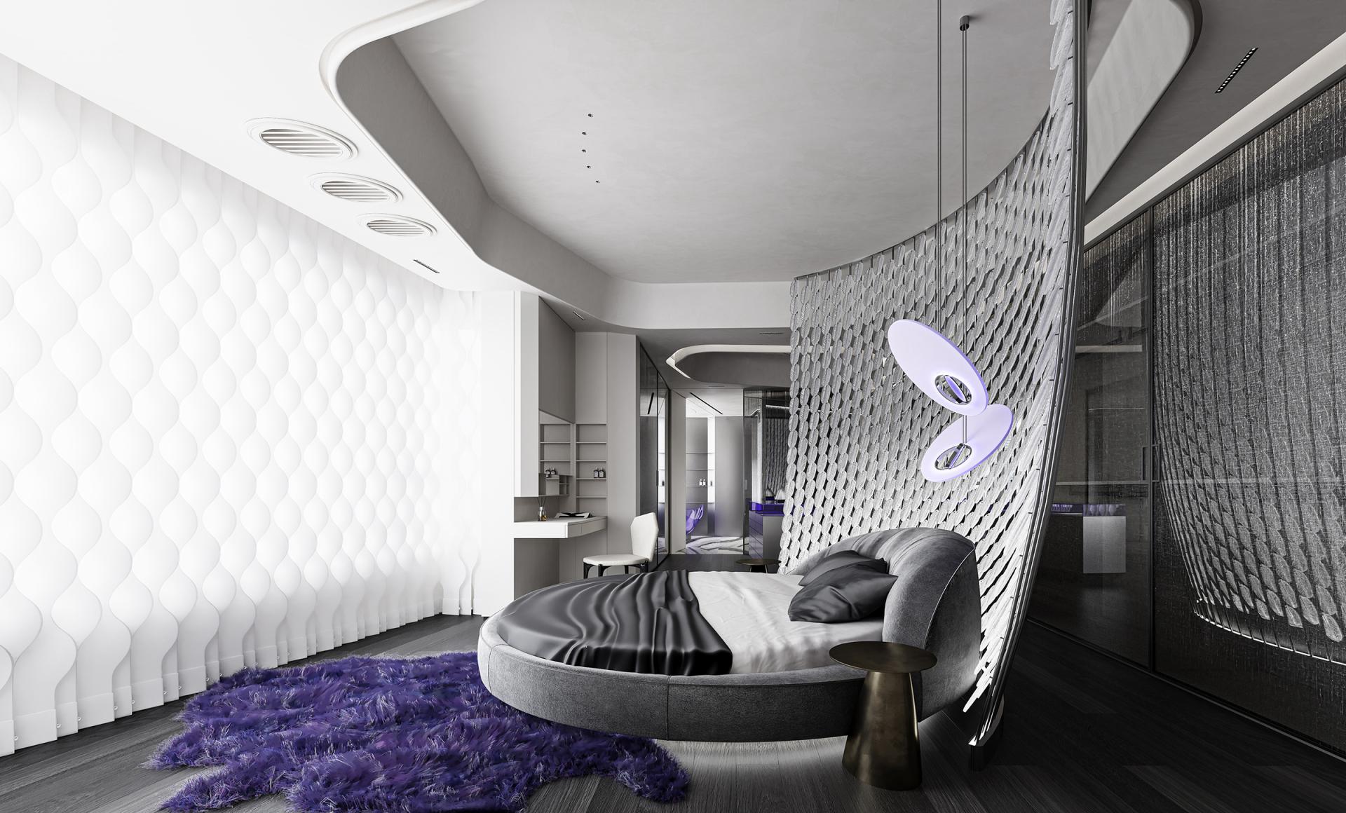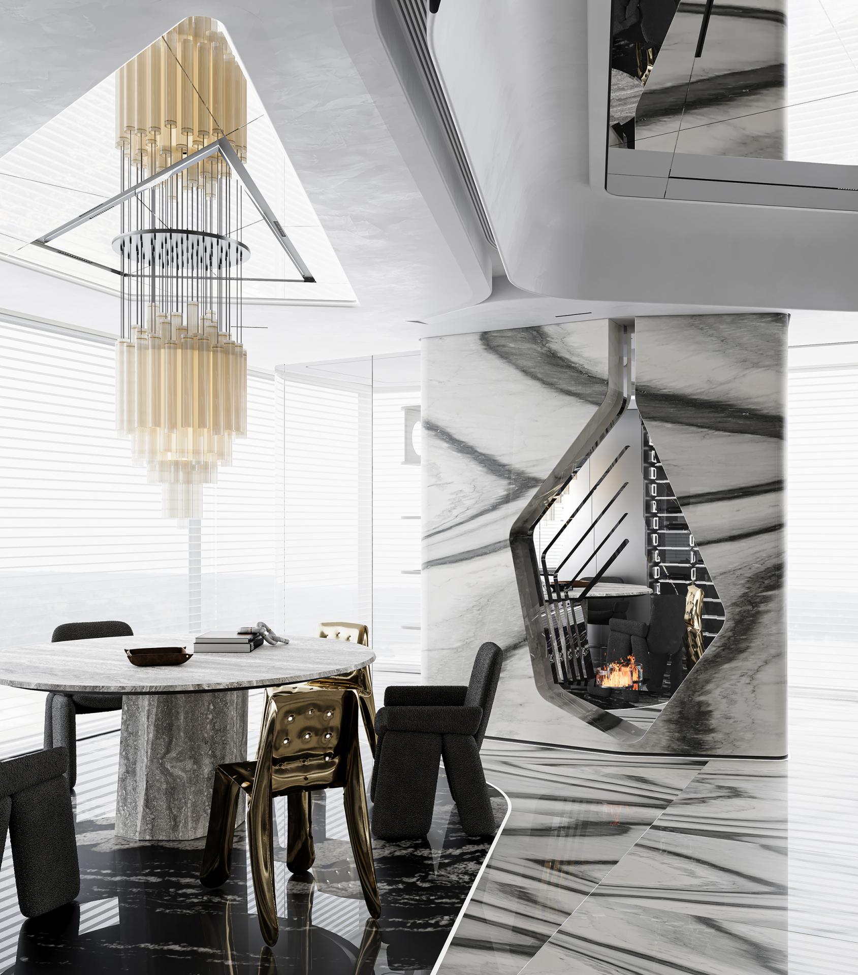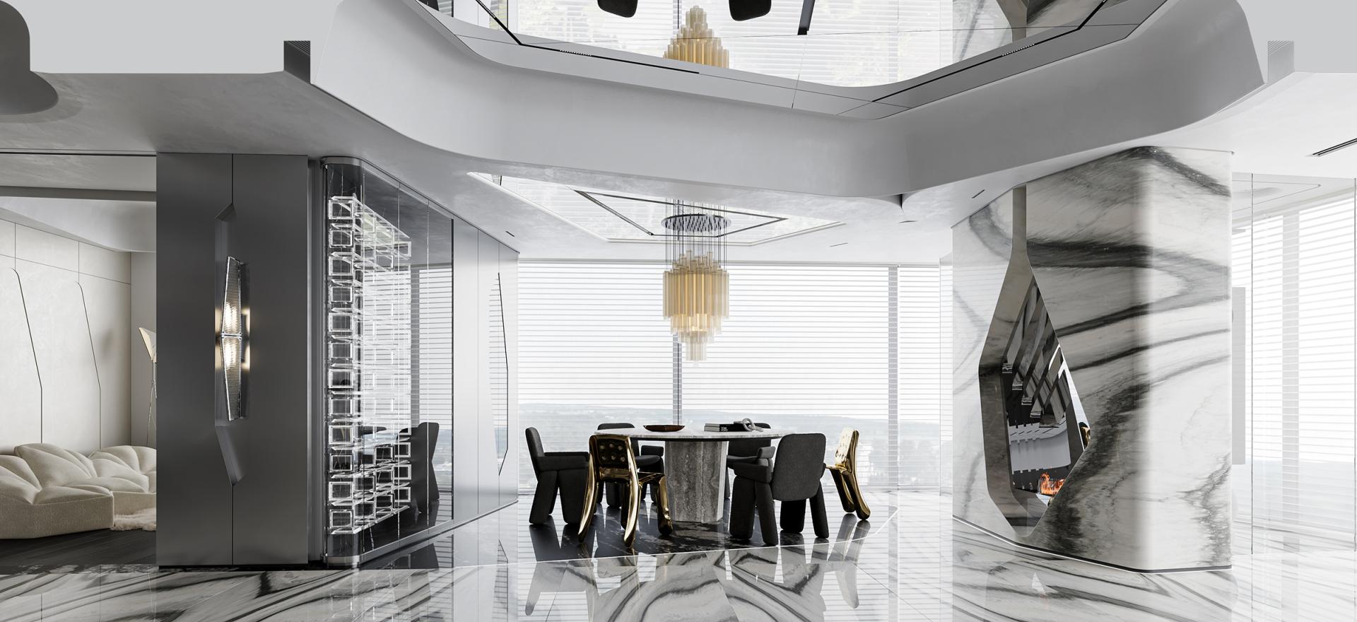 Inspired by the fluid aesthetics and precision of a McLaren sports car, the design adopts “folding lines” as a core visual and structural motif, infusing the space with futuristic and dynamic energy. From ceilings and walls to kitchen islands and furniture placement, this language of motion redefines spatial perception and creates a highly personalized living experience. At the entryway, a striking combination of a mechanical figurine, artistic glass, and a folded-line metal cabinet—enhanced by custom lighting—sets the tone with a sense of sci-fi elegance. These folding lines continue seamlessly across the interiors, lending continuity and rhythm to the spatial composition. The layout emphasizes flow and openness. The fully open living area resembles a contemporary art gallery, with iconic pieces like Edra’s On the Rocks and Boa sofas placed to create a sculptural interweave. Even structural limitations like immovable columns are transformed into design features, integrating seamlessly with visual focal points such as the fireplace and glass wine cabinet. Spatial transitions are enhanced by visual layering and material transparency. The open study introduces flexibility through a retractable partition wall, allowing it to convert into a guest room when needed. Design also accommodates pet-friendly features, including a multifunctional balcony zone for two cats. Material selection boldly embraces the homeowner’s affinity for high-performance aesthetics. Reflective metal finishes, mirror elements, artistic glass flakes, and Gucci Grey/Black stones are strategically combined to reflect a sci-fi and industrial vibe. These materials—applied with meticulous detailing—convey the essence of automotive design: sleek lines, bold textures, and technical refinement. In private areas, the folding-line concept continues through ceiling contours, island cabinetry, and even wall treatments. The master suite’s spatial path is designed as an immersive sequence—entry, vanity, shower, bathtub beneath a starry ceiling, lounge, and cloakroom—forming an experiential loop that mirrors the excitement of a curated journey. Feather glass flakes subtly blur visual boundaries to enhance depth and elegance. Overall, the design prioritizes personalization, movement, and immersive spatial storytelling, rejecting generic templates in favor of a home that embodies identity, lifestyle, and avant-garde aesthetics.