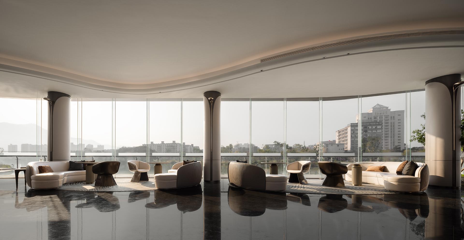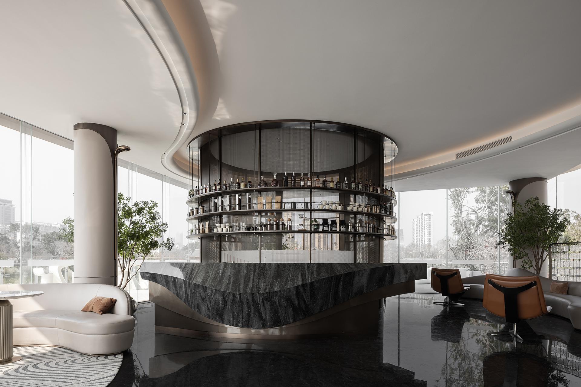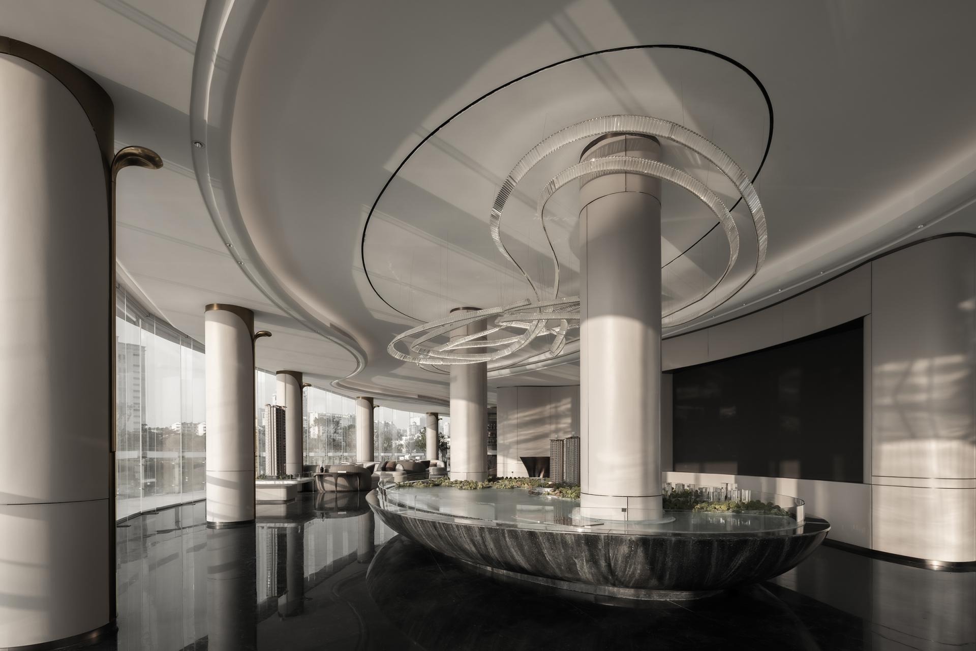 Nanshan North Lake is traversed by a river, and architecture serves as a medium for communication and emotional integration between humans and nature. The dynamic flow lines from landscape to architecture to space to every piece of furniture and accessory. Space is like a large stage, with north-south boundaries from the inside out, existing only in confusion, providing relaxation and freedom for the body and mind. The sand table is like a "visual art piece" in the sky, with a reasonable layout and perfect design, making the displayed products more eye-catching. Strolling through it, it feels like being immersed in a graceful and melodious architectural movement. The dynamic flow lines, undulating along the terrain and passing through buildings, all flow with a beautiful spatial melody. Even with a brief pause, immerse oneself in it and feel the spatial rhythm of this emotion. The water bar is a flowing 'design node', showcasing the designer's ultimate expression of spatial atmosphere from the overall layout to the placement of small objects. The reception and rest area is not just a functional area, but more like an emotional hub. The design of the reception area aims to create a warm and comfortable space, allowing visitors to feel the warmth of home. A whole circle of exquisite pillars shuttle through the green plants, creating a unique atmosphere in the space under the stars of the Milky Way. And the lake in front of them gives these flowing breaths even more vitality. The selection and layout of green plants take into account indoor air quality, visual effects, and resonance with the natural environment, making the entire space full of vitality and energy. This sales office is not only a place for sales display, but also an emotional and beautiful architectural artwork. It integrates advanced concepts of modern architectural design while also showing consideration and attention to the emotional needs of nature and humanity. Here, people can feel the harmonious coexistence between architecture and nature, find inner peace and satisfaction, and experience the beauty and warmth of life.