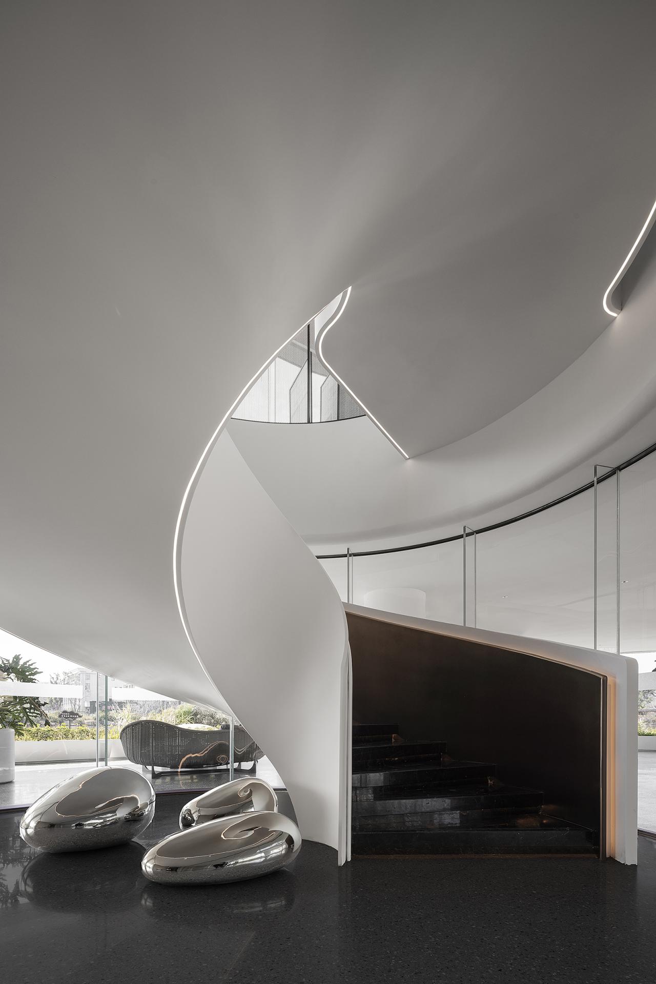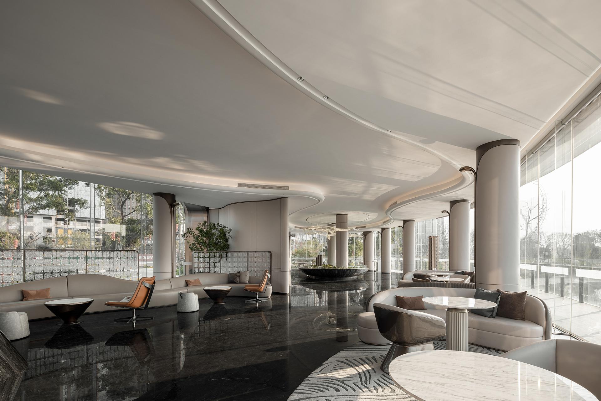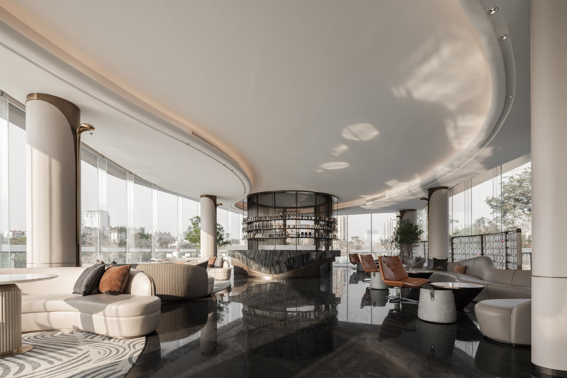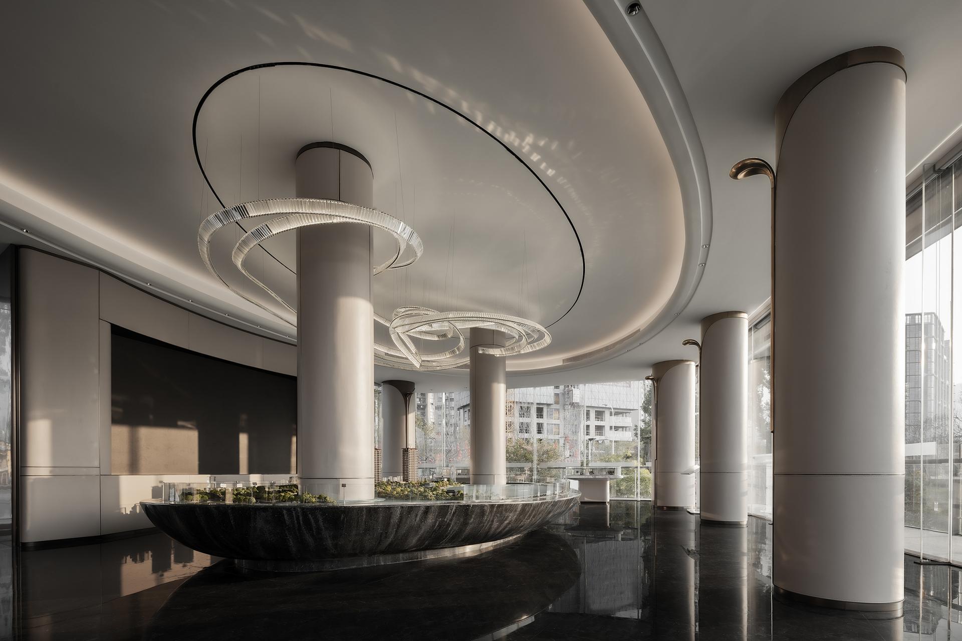 Nanshan North Lake is traversed by a river, and architecture serves as a medium for communication and emotional integration between humans and nature. The dynamic flow lines from landscape to architecture to space to every piece of furniture and accessory. Space is like a large stage, with north-south boundaries from the inside out, existing only in confusion, providing relaxation and freedom for the body and mind. The sand table is like a "visual art piece" in the sky, with a reasonable layout and perfect design, making the displayed products more eye-catching. Strolling through it, it feels like being immersed in a graceful and melodious architectural movement. The dynamic flow lines, undulating along the terrain and passing through buildings, all flow with a beautiful spatial melody. Even with a brief pause, immerse oneself in it and feel the spatial rhythm of this emotion. The water bar is a flowing 'design node', showcasing the designer's ultimate expression of spatial atmosphere from the overall layout to the placement of small objects. The reception and rest area is not just a functional area, but more like an emotional hub. The design of the reception area aims to create a warm and comfortable space, allowing visitors to feel the warmth of home. A whole circle of exquisite pillars shuttle through the green plants, creating a unique atmosphere in the space under the stars of the Milky Way. And the lake in front of them gives these flowing breaths even more vitality. The selection and layout of green plants take into account indoor air quality, visual effects, and resonance with the natural environment, making the entire space full of vitality and energy. This sales office is not only a place for sales display, but also an emotional and beautiful architectural artwork. It integrates advanced concepts of modern architectural design while also showing consideration and attention to the emotional needs of nature and humanity. Here, people can feel the harmonious coexistence between architecture and nature, find inner peace and satisfaction, and experience the beauty and warmth of life.