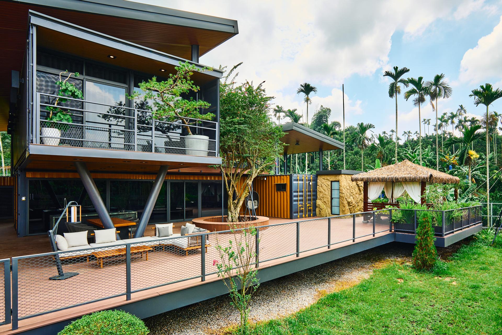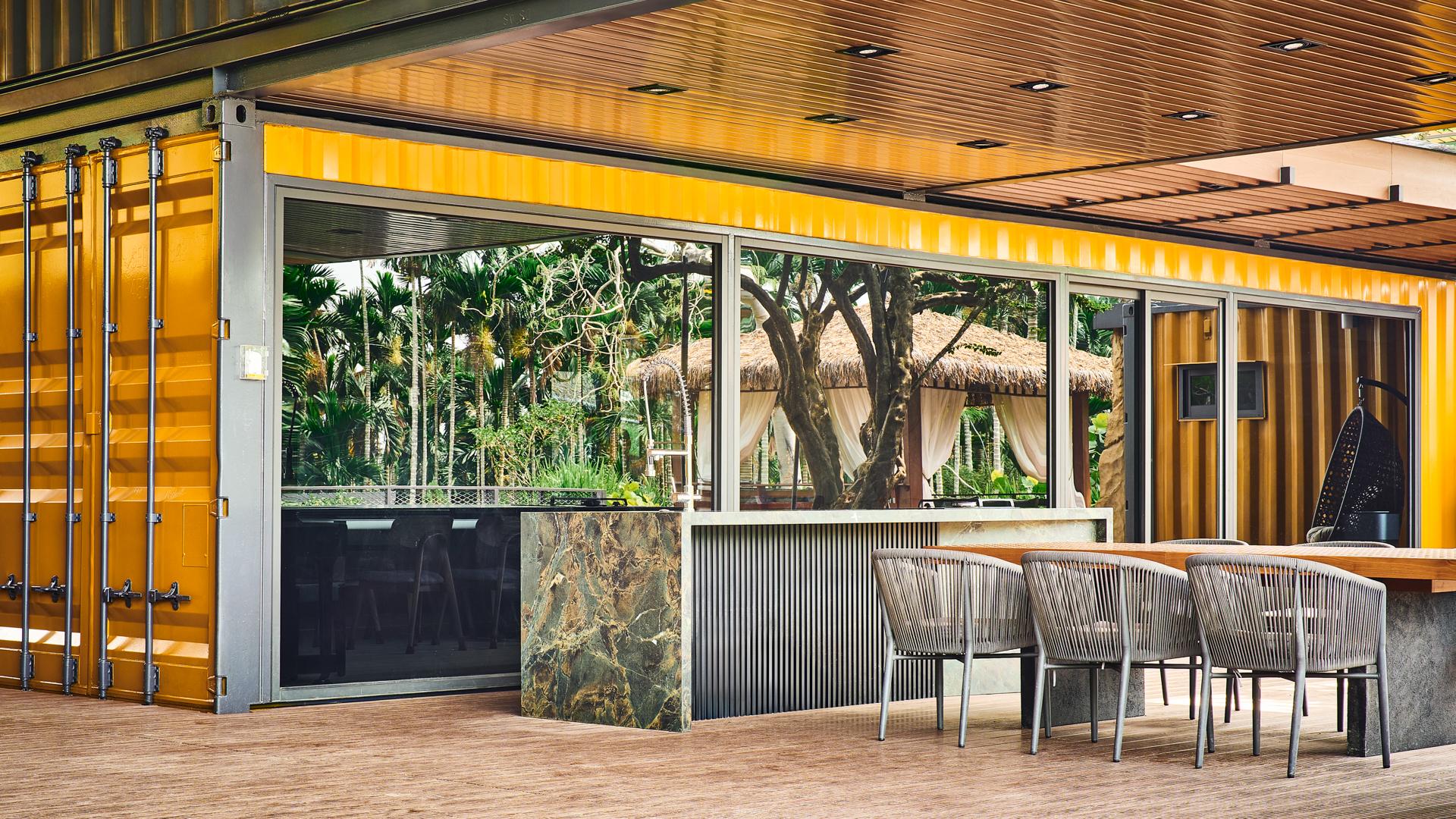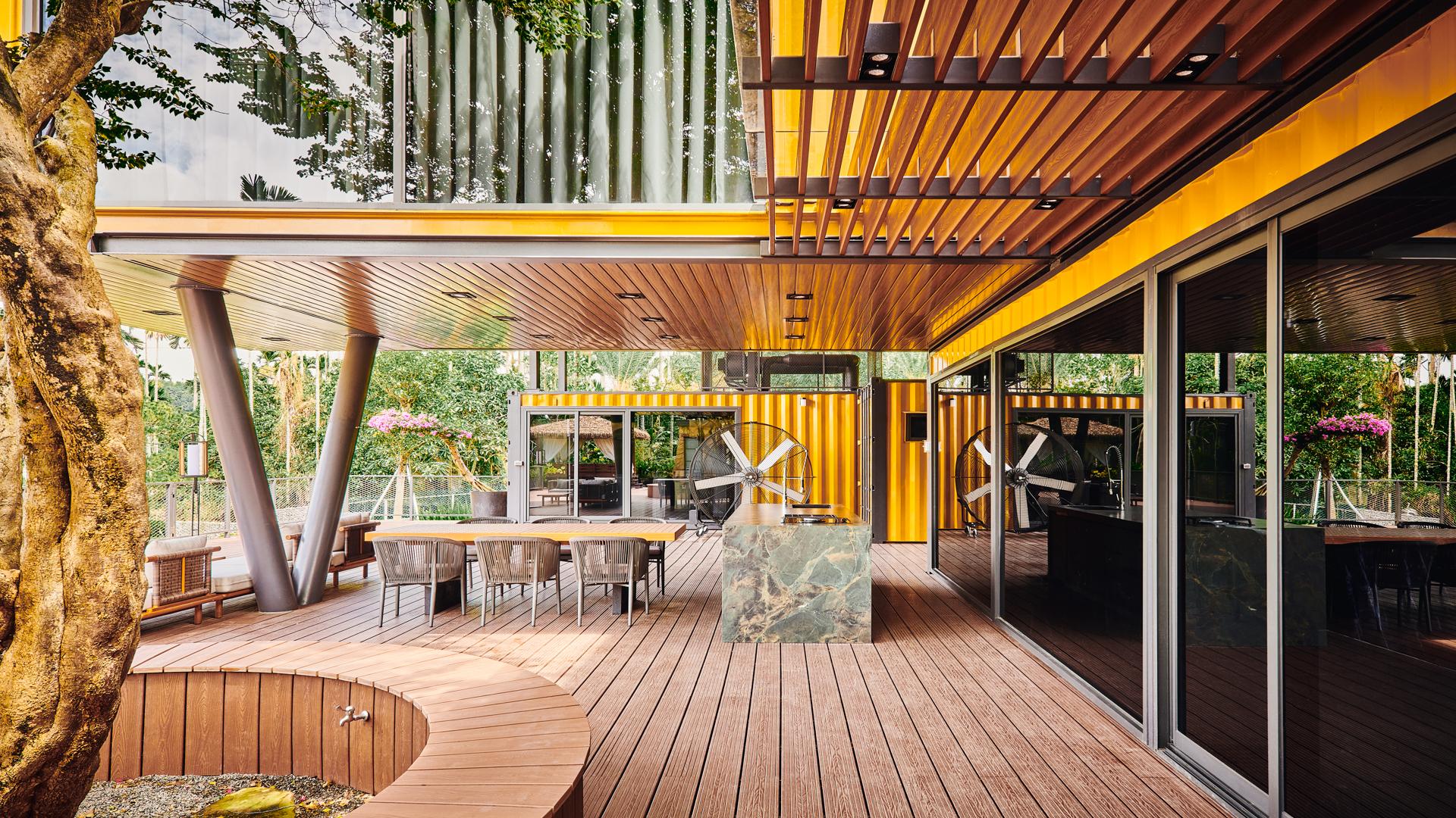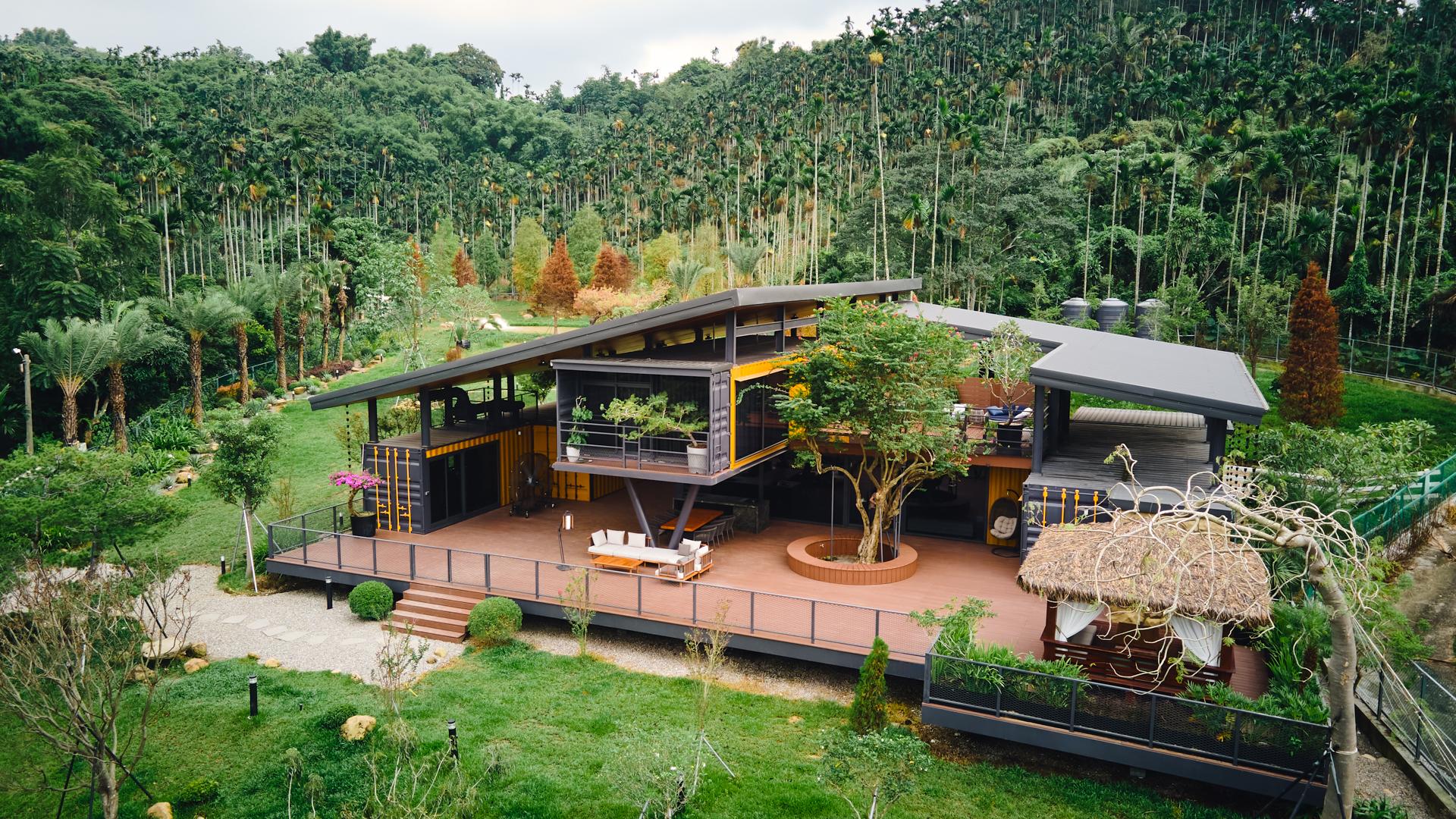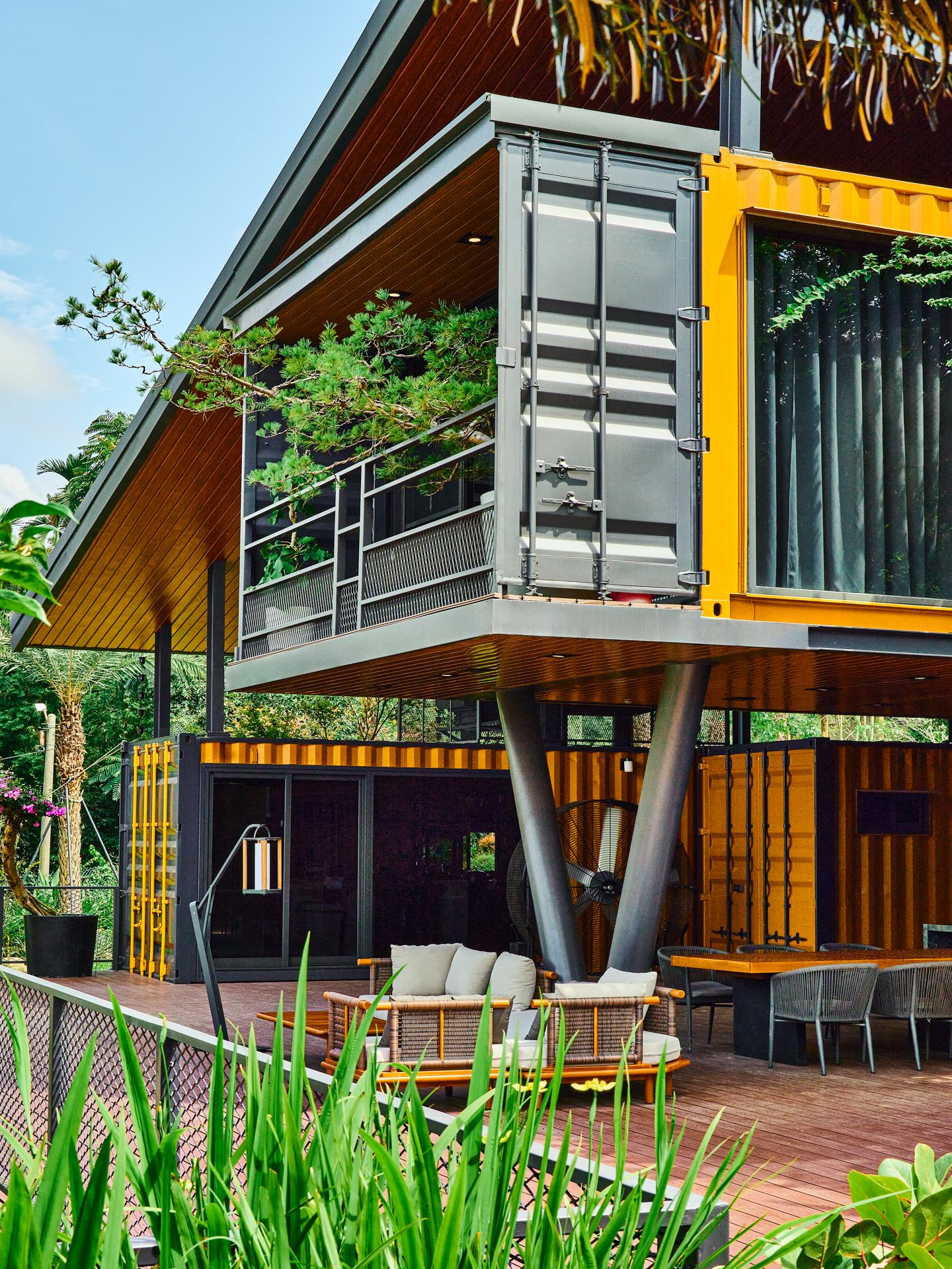 Every structural decision serves this reinterpretation. Reinforced and raised ninety centimeters above ground, the containers maintain ventilation, drainage, and protection from moisture and terrain shifts. Cross-ventilation channels and an open courtyard choreograph airflow and light, while the overall configuration achieves equilibrium with climate and topography. The black-and-yellow composition and stone-filled expanded-metal façades express both industrial heritage and rural tactility, anchoring the building within its landscape.