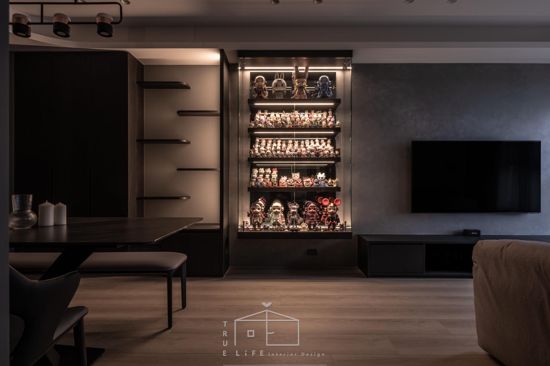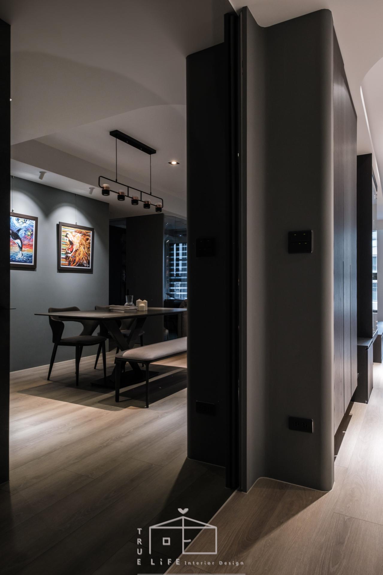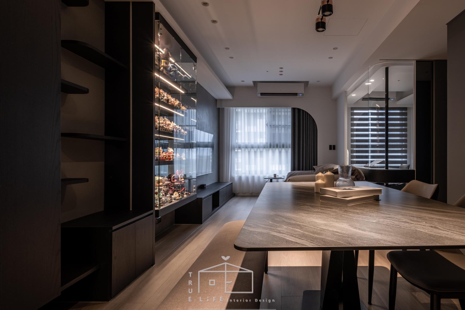 The residence in Tamsui was designed for two homeowners and their cat, who envisioned a space that could accommodate daily life, collectibles, and future pets. The design concept originated from the couple’s contrasting preferences: the host favored clean brightness, while the hostess loved the depth of black tones. The designer resolved this difference by balancing black and gray, creating a mood poised between cool restraint and gentle warmth. The resulting ambience resembles the glow of sunset—hence the name Twilight Serenity. At the moment of completion, when the lights illuminated the interiors, the atmosphere revealed a quiet yet profound charm.
