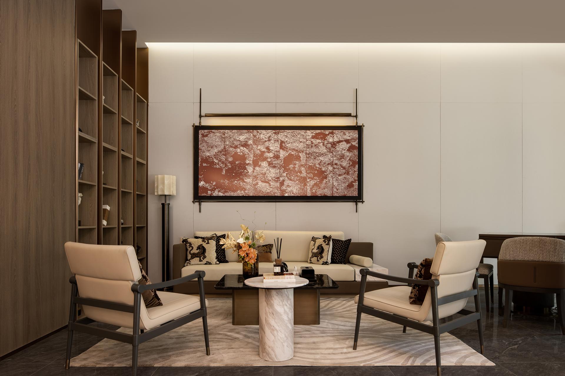 The soft furnishing design of the Wuyue Xuefu Wenyue Peony Club in Dongying is positioned as a high-end art exhibition-style space that integrates local culture with a modern urban lifestyle. Rooted in the idea of “evolution of human settlement and realization of refined living,” the design enhances both spatial quality and user experience through a delicate balance of art and functionality.