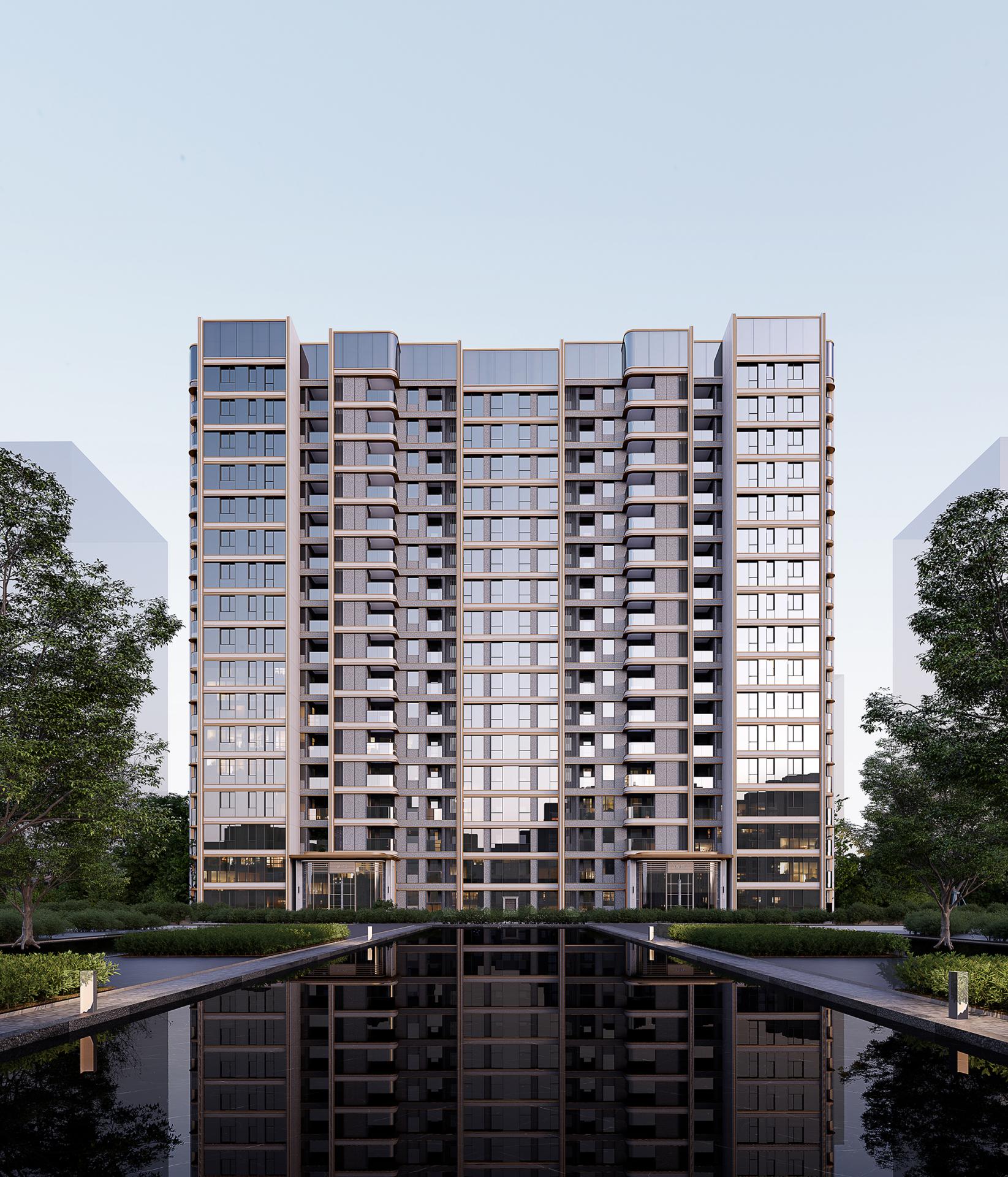 The large proportion of super-sized glass-metal exterior walls, combining high-transparency Low-E glass with custom metal profiles, enables the building facade to present minimalist aesthetics while maintaining excellent residential functionality;