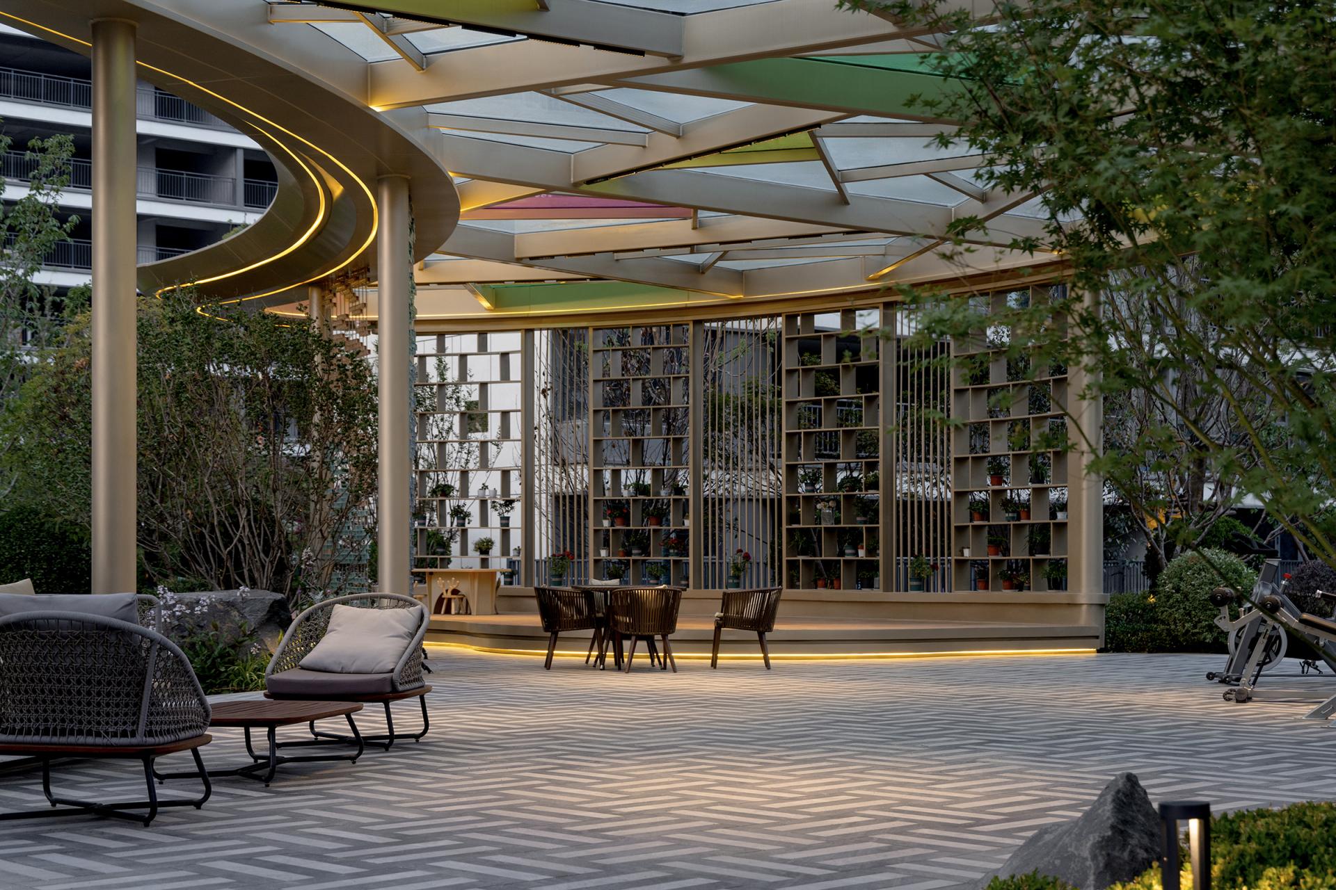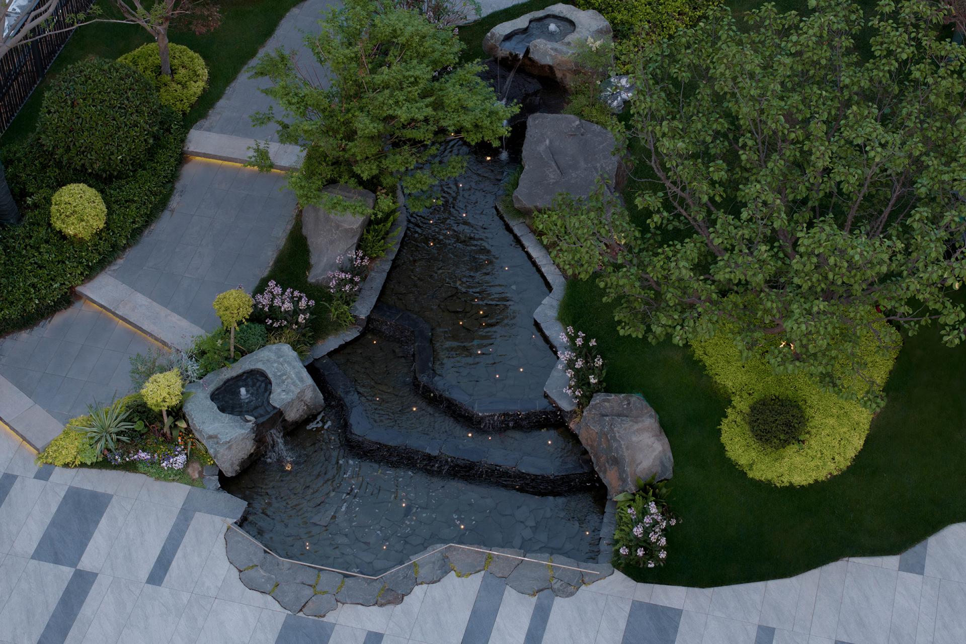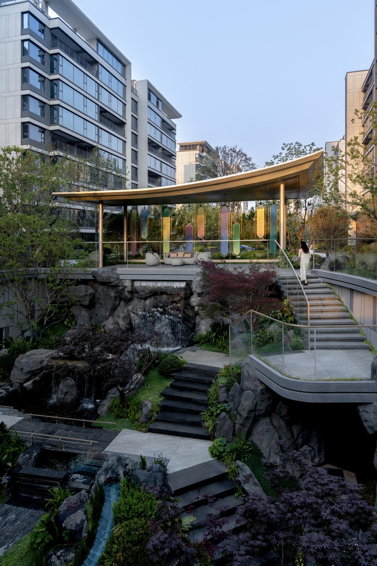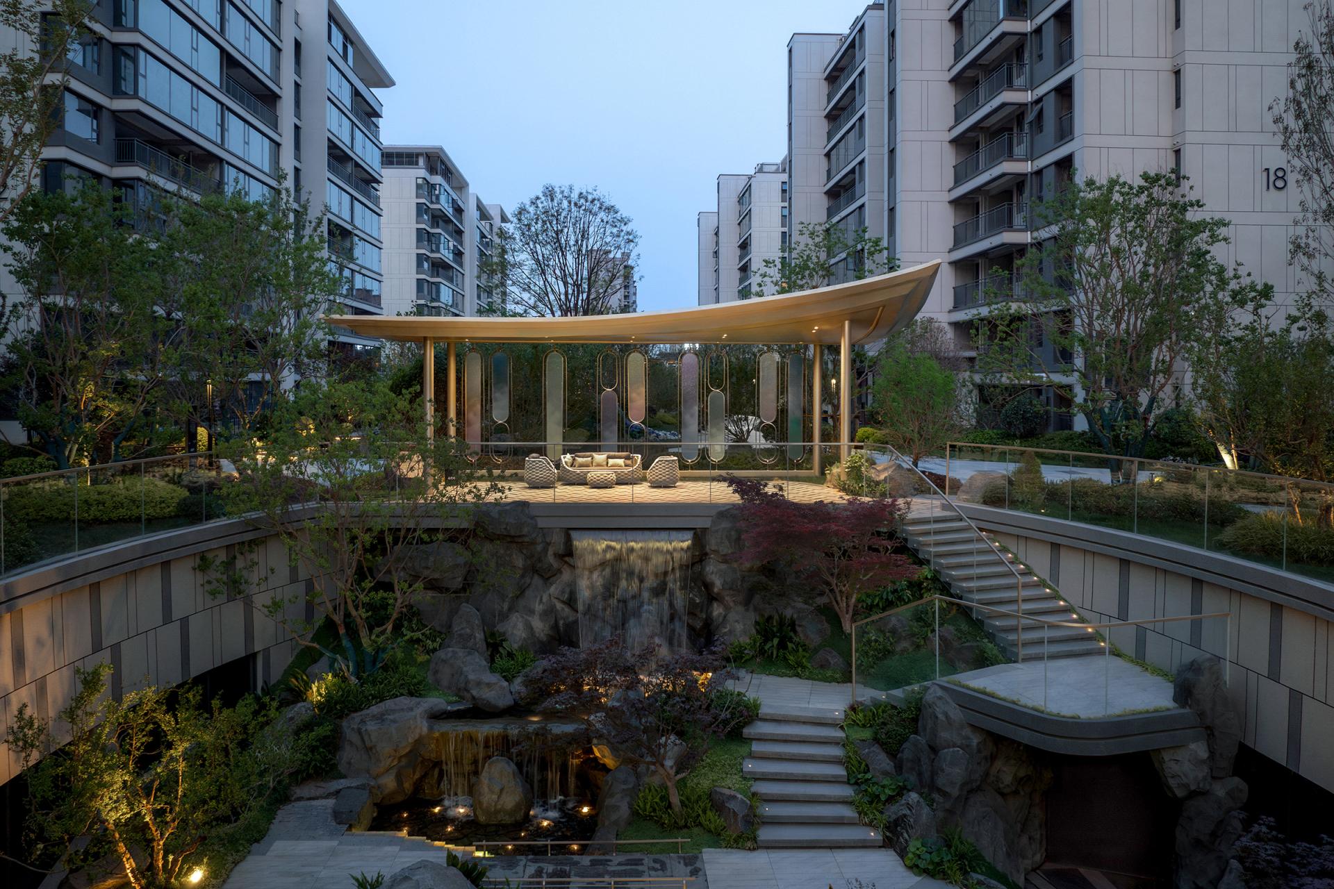 Guided by the theme of “Harmonious Nine Streams · Blossoming Pool Banquet,” the landscape unfolds into immersive spatial scenes, welcoming residents through ceremonial gateways, panoramic waterside platforms, secluded woodland paths, and poetic pavilions for leisure and cultural gatherings. The intention is to offer a journey through layered natural experiences, where every turn reveals shifting light, water, and vegetation. Elements such as a cascading 5-meter waterfall, multi-level reflective pools, floating lights, and a 9.5-meter tea pavilion with flying eaves evoke the dreamlike splendor of imperial retreats, allowing residents to feel as though they have stepped into a living scroll.