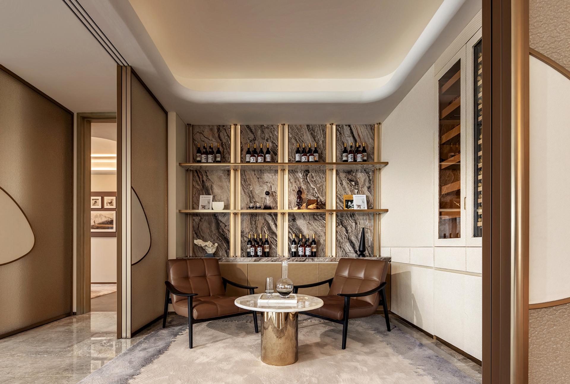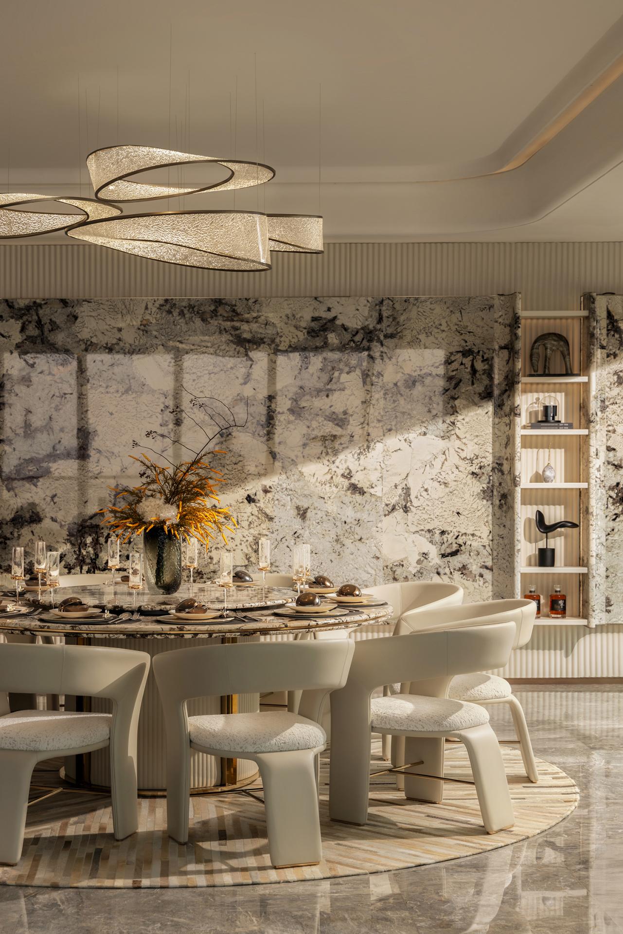 The open kitchen incorporates a Calacatta marble island, improving spatial flow and functionality. The wine room features a backdrop of Venice Brown marble, contrasting its cool tones with warm orange leather to create an inviting yet enigmatic atmosphere.