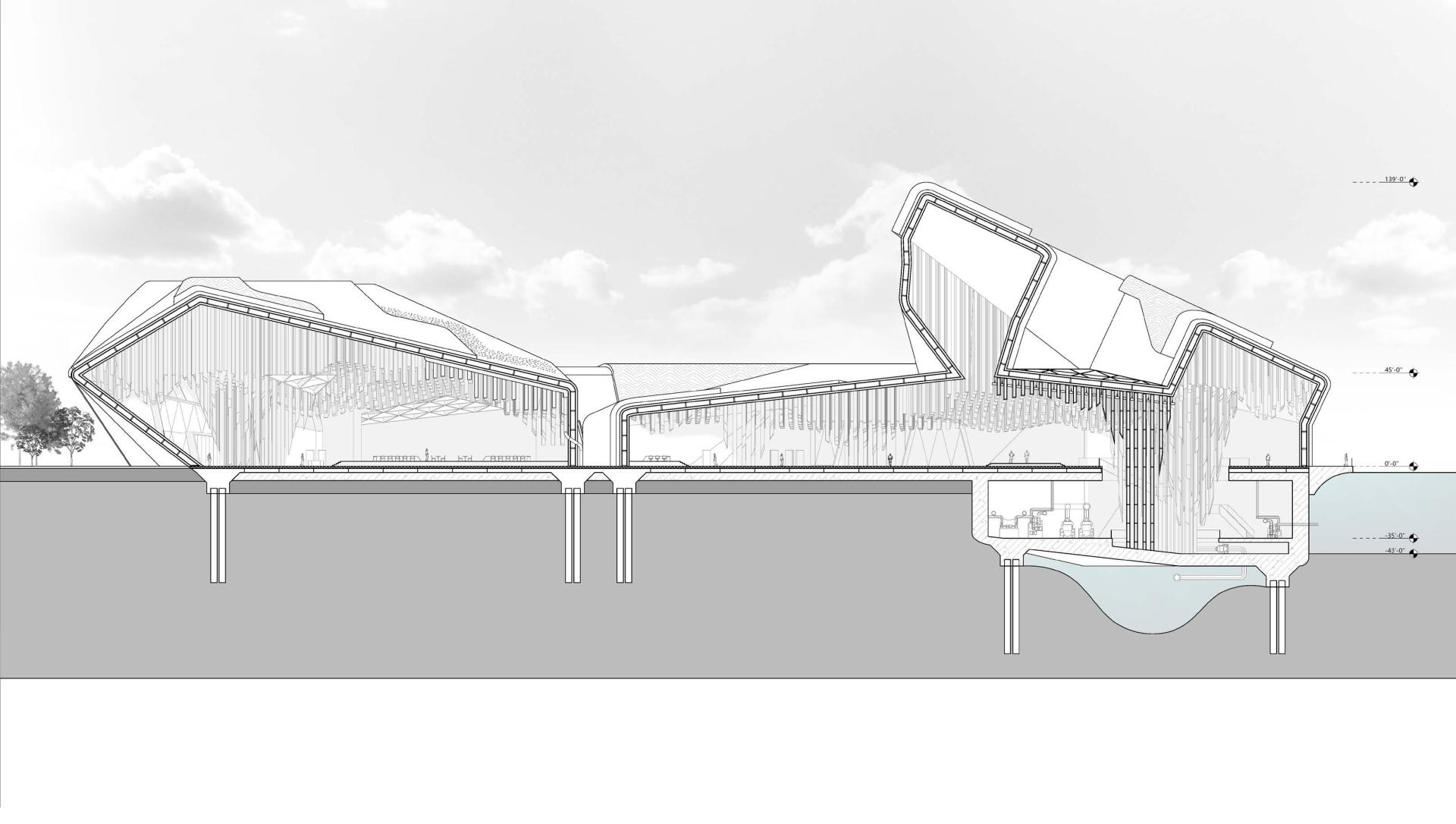 The building adopts a diagrid structural system to achieve a column-free, open plan that maximizes spatial flexibility. Circulation and egress are carefully designed to ensure both safety and fluidity. Taking advantage of its riverside location, the design introduces natural