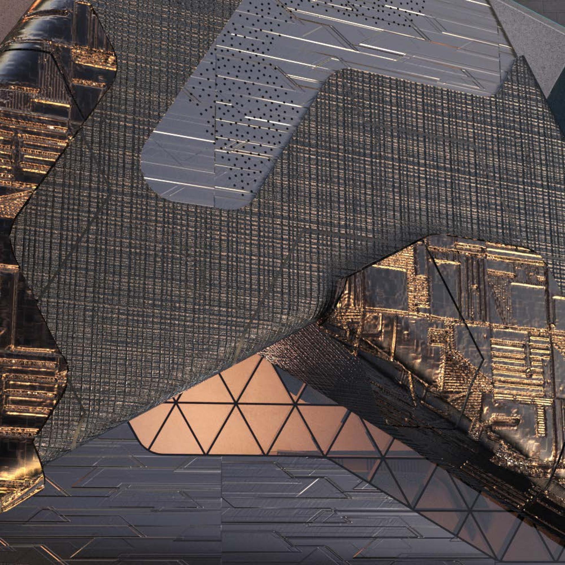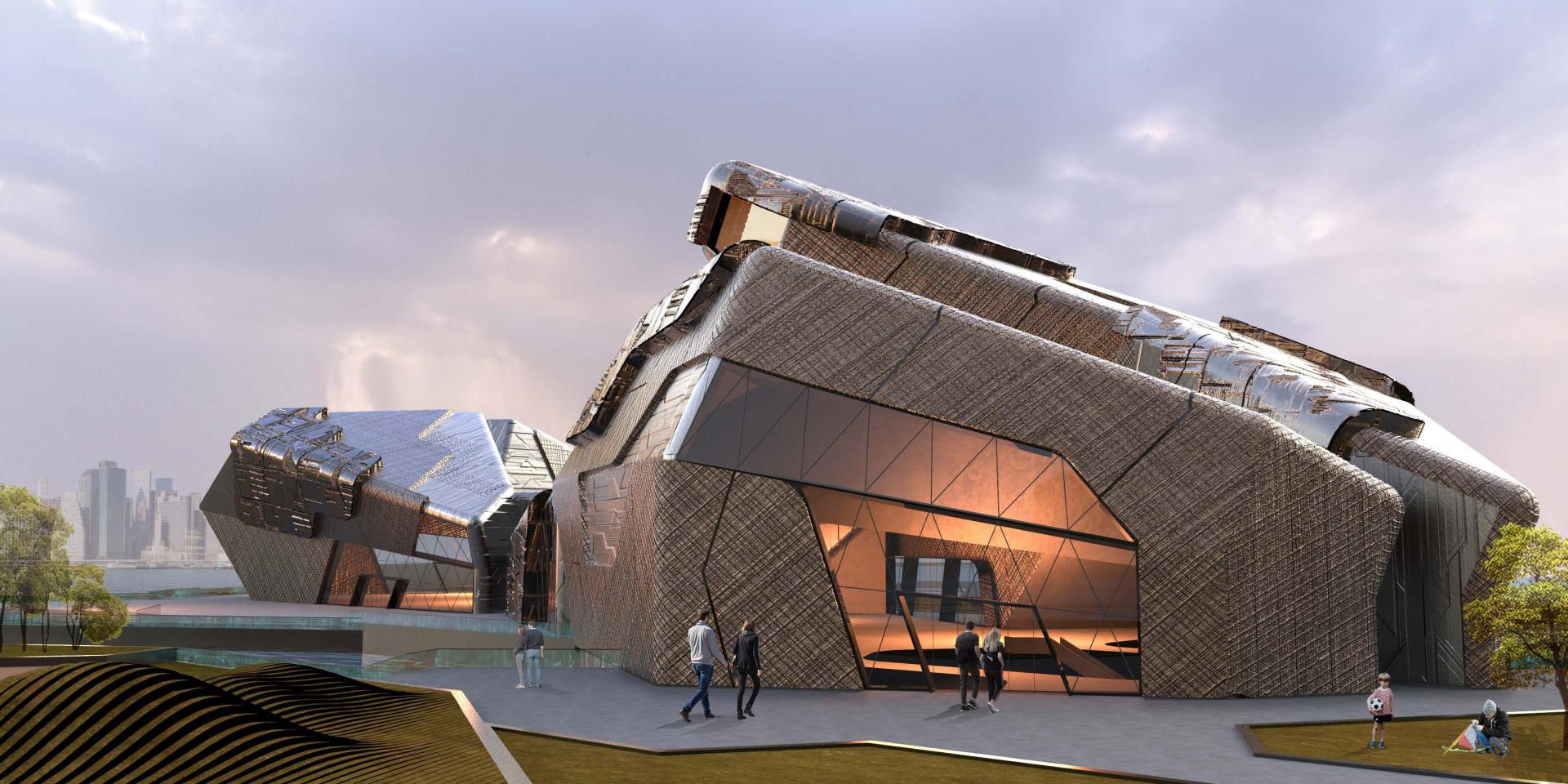 The façade expresses a dual identity: the museum side opens toward the city, representing openness and inclusiveness, while the data center side remains private and introspective, emphasizing precision and control. Inside, the golden servers contrast dramatically with the