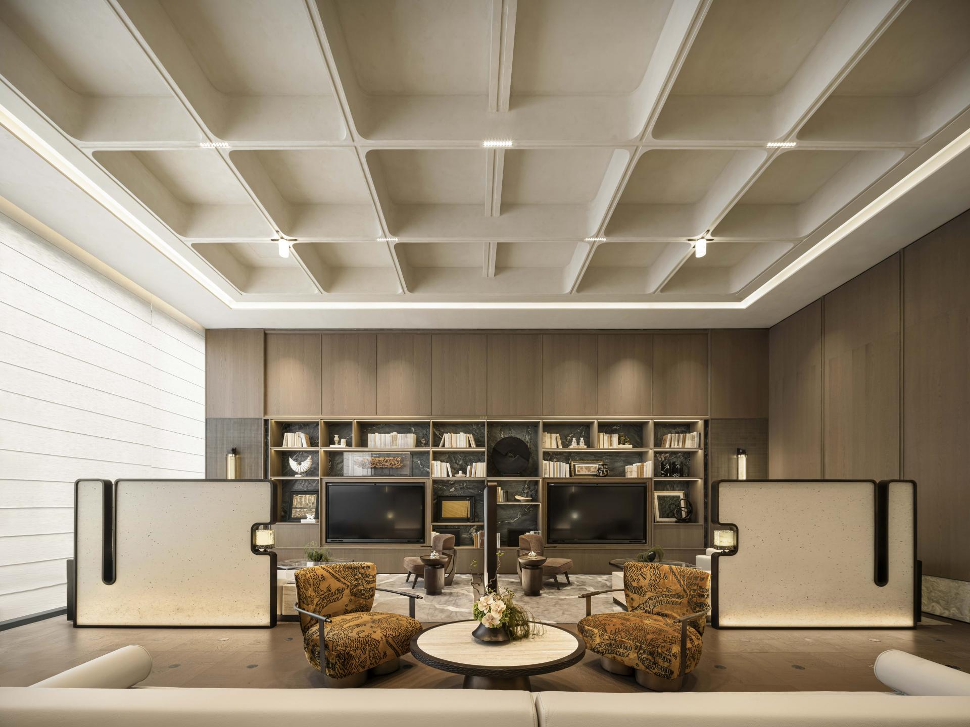 The negotiation area is named "Linyou Painting Realm", inspired by the serene imagery of the unicorn wandering through the garden. The space is based on the philosophical concept of "changing scenes with each step" in Suzhou gardens, and through the abstract translation of the "Eighteen Scholars Scroll", distinct functional areas are delineated. Classic elements such as doors, corridors, and eaves are deconstructed into simple geometric lines, either suspended from the ceiling or hidden behind the walls, reinterpreting the poetic charm of the garden in modern design language.