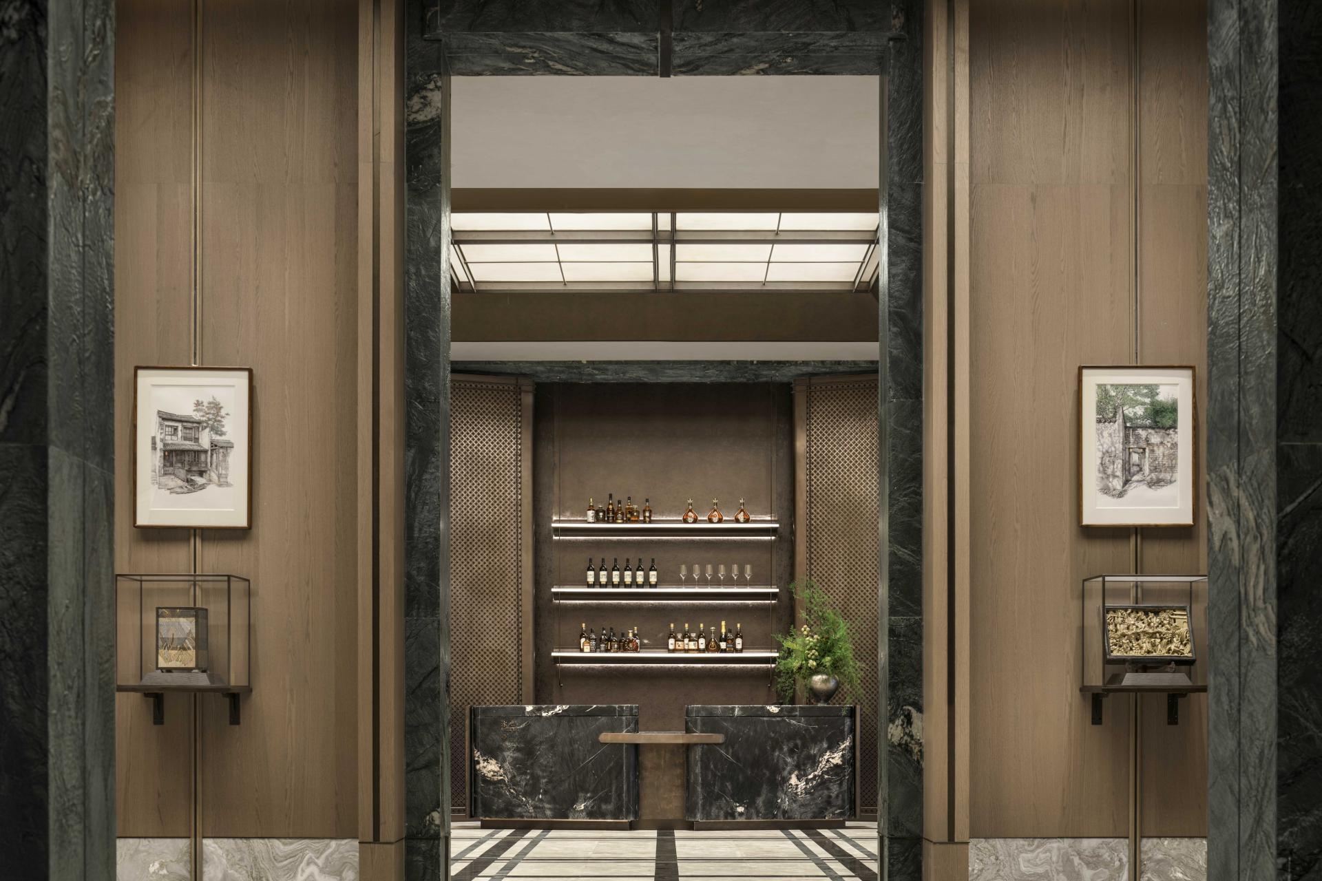 The water bar area is inspired by the "mountains and rivers standing tall, with silk patterns flowing and shining". It transforms the grandeur of natural mountains and forests and the "weaving interweaving" of the Song brocade weaving technique into a spatial narrative. The water bar counter maintains the grand and imposing atmosphere of the space. The antique copper luster of the background wall and the flowing texture of the blue-gray marble counter complement each other, along with the black and white checkered floor pattern. The overall spatial language is like the majestic and solemn mountain ridges, or the winding and flowing patterns of brocade.